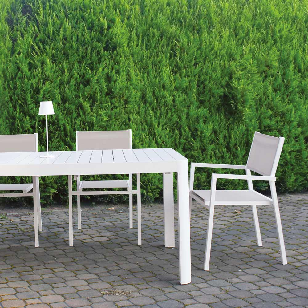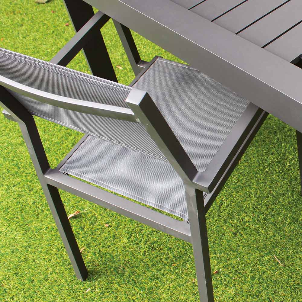 Sæde og ryglæn i tekstilene , et åndbart og behageligt teknisk materiale, garanterer en ergonomisk og behagelig siddeoplevelse selv på de varmeste dage. Farven giver stolen en sober elegance , perfekt til at ledsage spise- eller sofaborde i haver, terrasser eller kontraktrum.