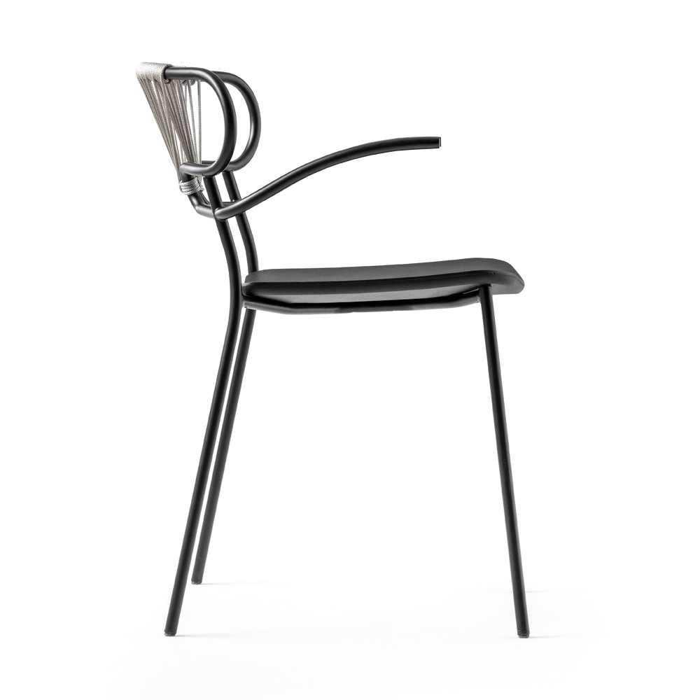 Stol til spisestue eller køkken lavet i Italien med sortmalet metalstruktur og grå reb med sortlakeret sæde i ask. En original møbleløsning i sin enkelhed, beriget og gjort unik ved den særlige form på ryglænet, der opnås gennem krumningen af et enkelt metalrør og af detalje vævet i reb, der giver en original og udadvendt personlighed. Takket være de neutrale finish og dets væsentlighed er denne stol en perfekt løsning til moderne miljøer, hvor der kræves en funktionel og kreativ idé, der ikke går ubemærket hen, mens den forbliver diskret, samtidig med at den giver mulighed for stabling for at optimere dine rum fuldt ud.