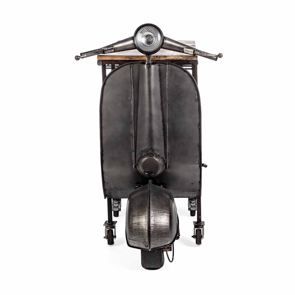Denne designkonsol har strukturen med den særlige form af en motorcykel lavet af stål , mens toppen er i mangotræ og inkluderer flaske- og kopholdere.