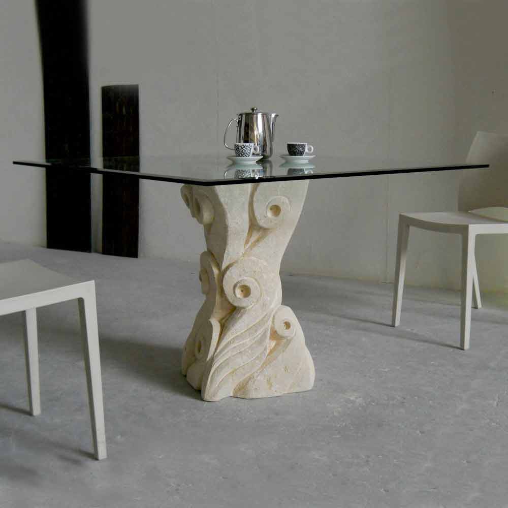 Tabel Made helt moderne square spisning i Italien, med en central base i Vicenza natursten, formede manuelt fra den faste blok, med floatglas top af 15 mm tyk, fast til bunden ved en aftagelig stål flange.