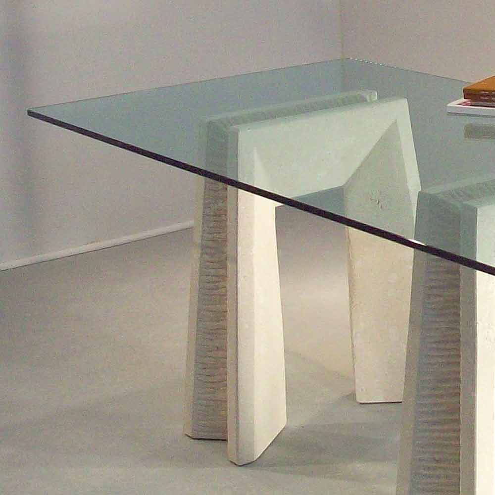 Rektangulært spisebord moderne Made i Italien med dobbelt base i natursten Vicenza, manuelt skåret fra fast blok og med floatglas top tykkelse på 15 mm, der hviler på baserne.