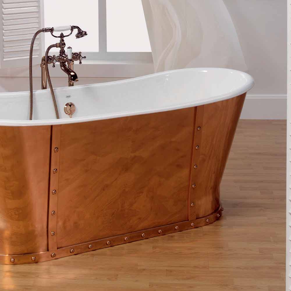 Fritstående badekar helt lavet af støbejern, der hviler på jorden. Intern 2 mm titanemaljeret finish og udvendigt kobberbelagt. Badekar, der repræsenterer toppen af luksus!