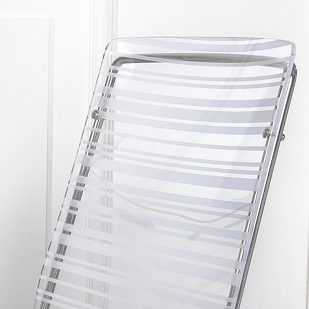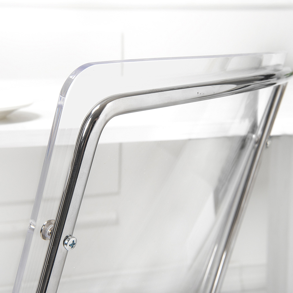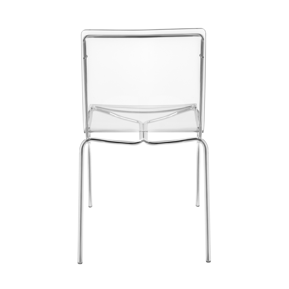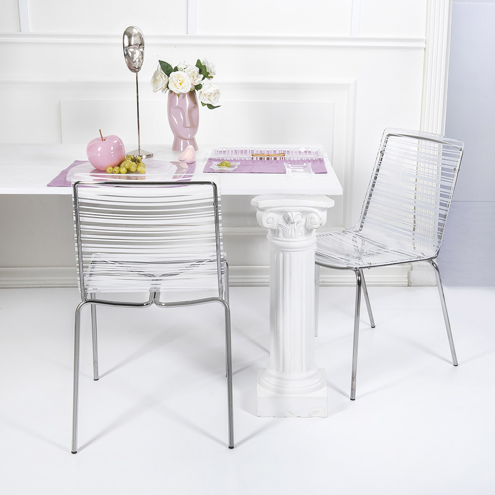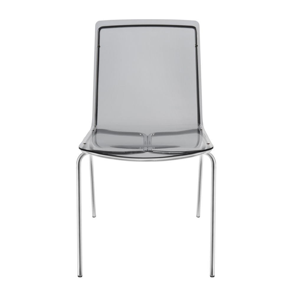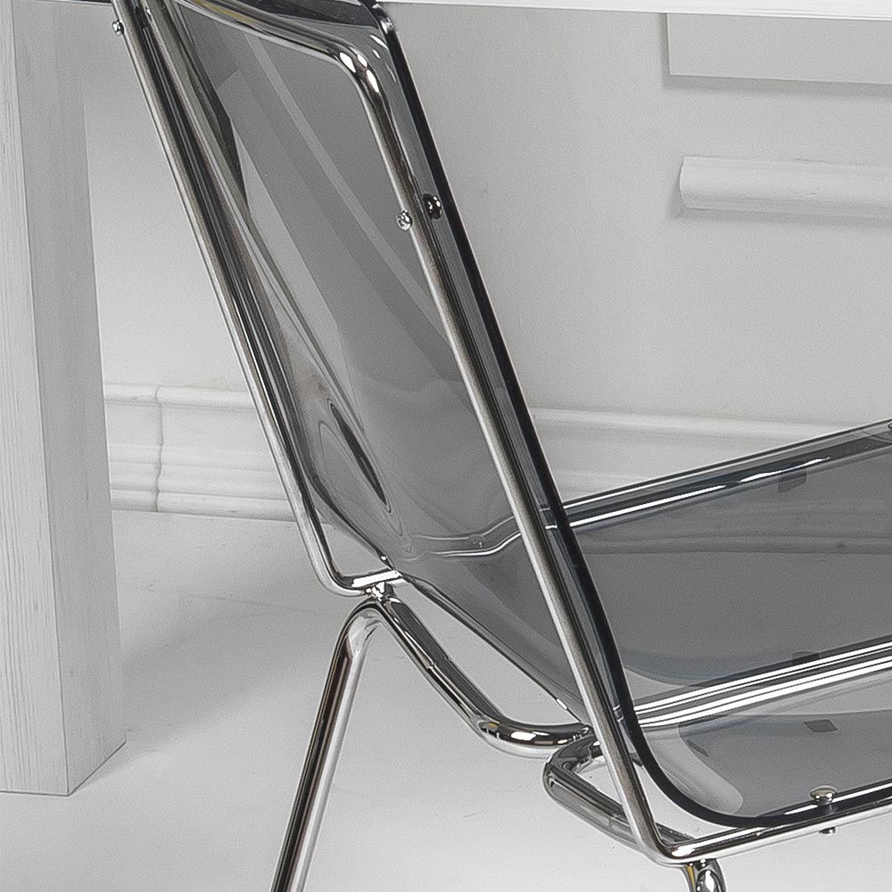 Spisestuestol helt fremstillet i Italien med skal af plexiglas og ben i forkromet jern , som også gør den let at stable. Karakteriseret af et enkelt og rent design , er dette møbel alsidigt og moderne takket være de innovative materialer, der er brugt, som fremhæver dets geometriske elegance .