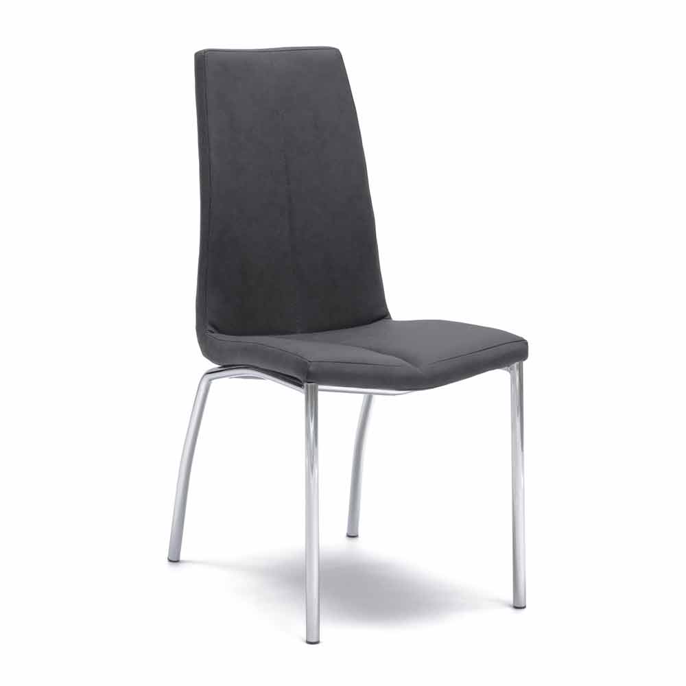 Stol med forkromet metalbase. Sæde og ryg betrukket med polstret imiteret læder. Fås i forskellige farver: vælg den ønskede finish i rullemenuen.