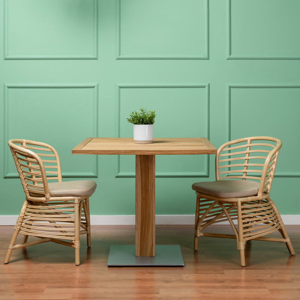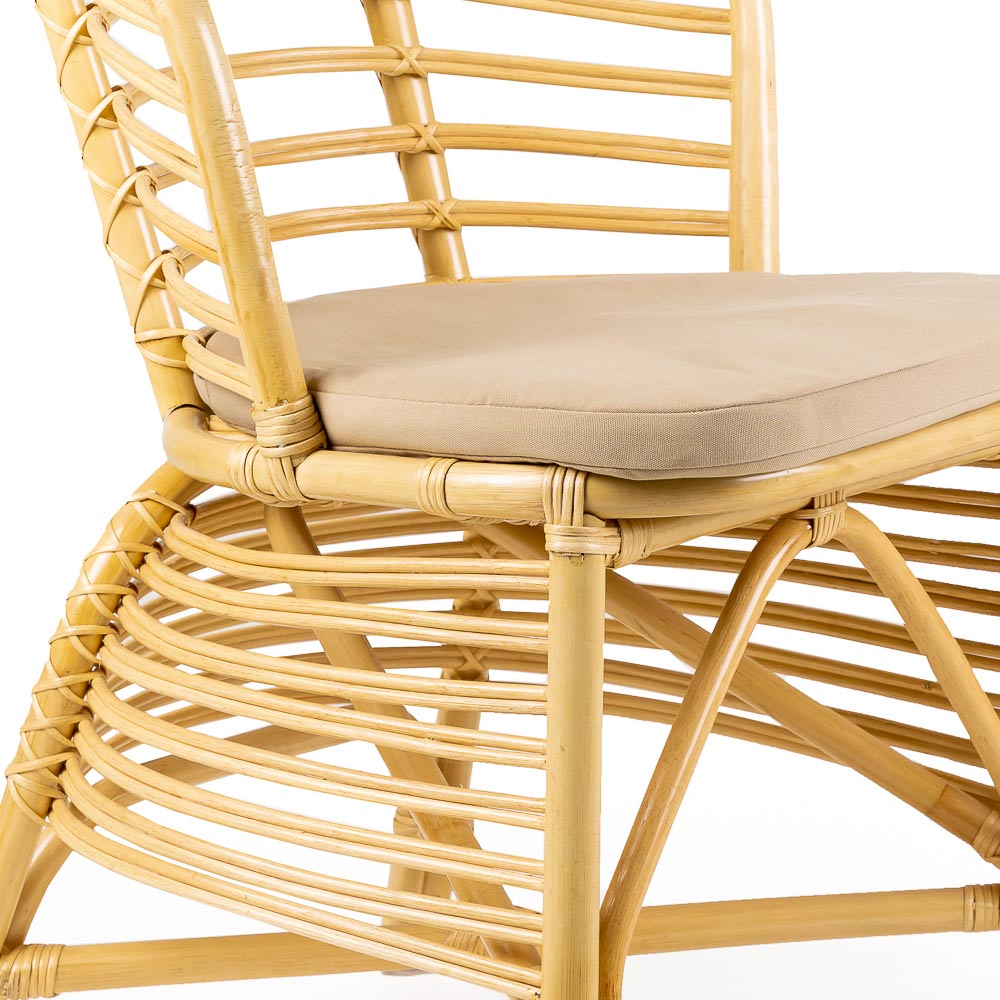 Udestol fremstillet af vævet naturrotting og udstyret med en sædehynde med betræk i standard "Stone Beige" finish .