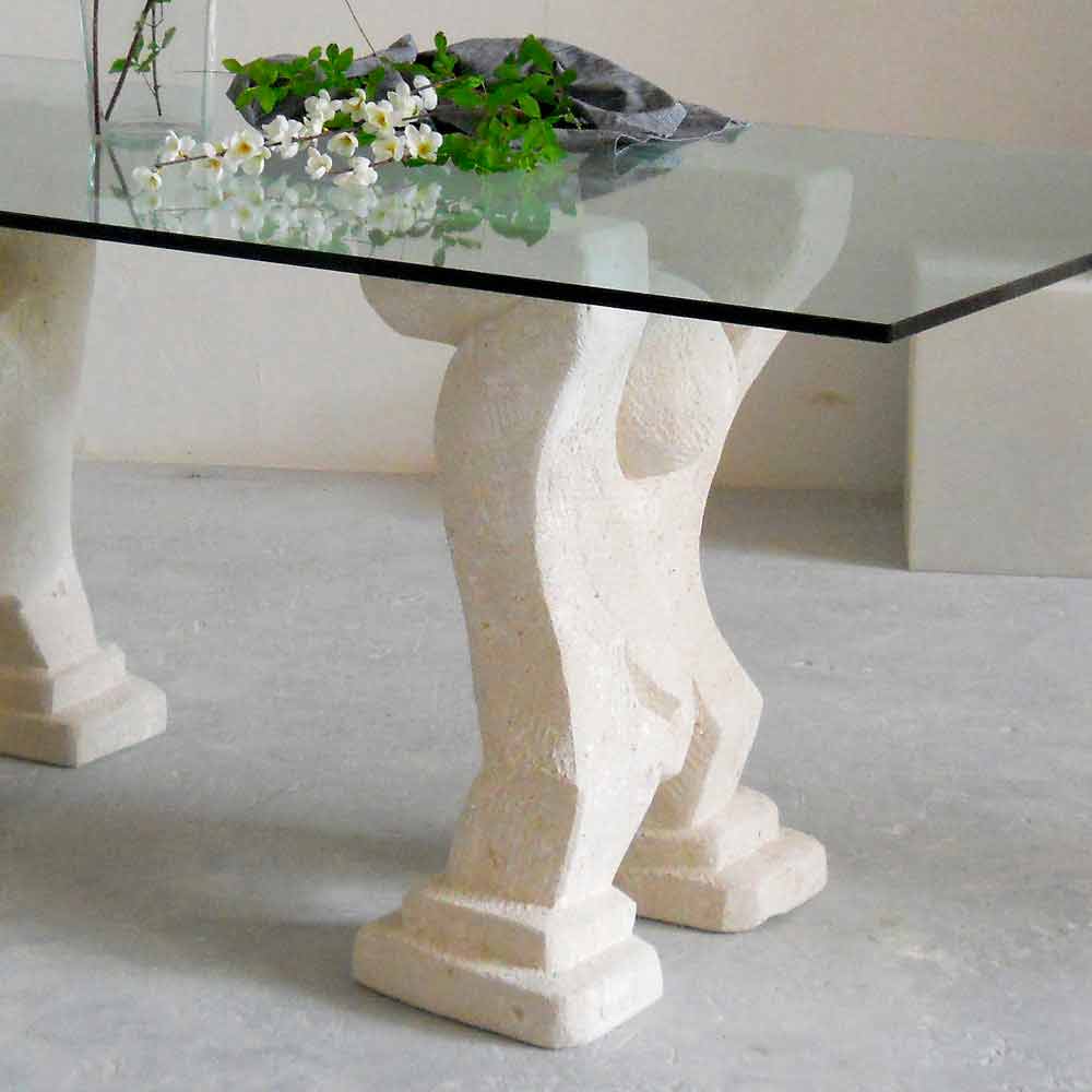 Rektangulært spisebord moderne Made in Italy med dobbelt base i natursten Vicenza, manuelt skåret fra fast blok og med floatglas top tykkelse på 15 mm, der hviler på baserne.