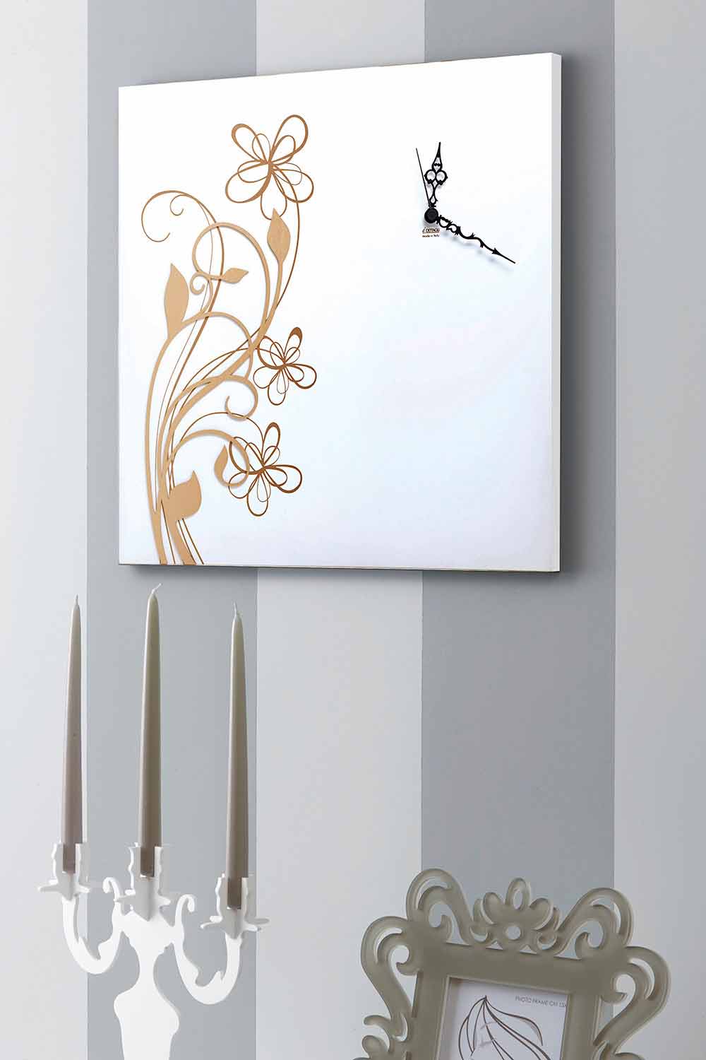 Firkantet vægur i hvidt træ med blomsterdekoration i naturligt træ, moderne og lavet i Italien.