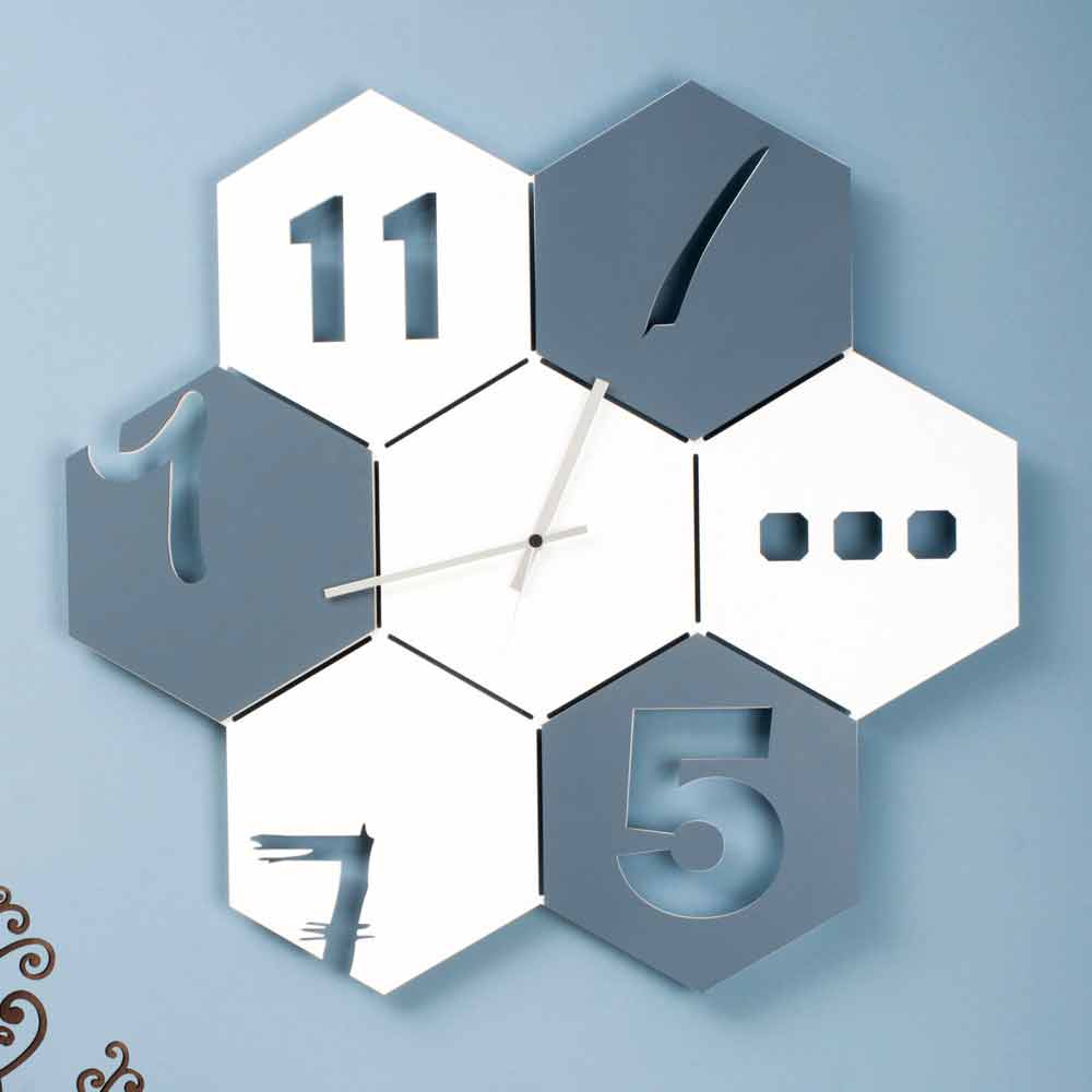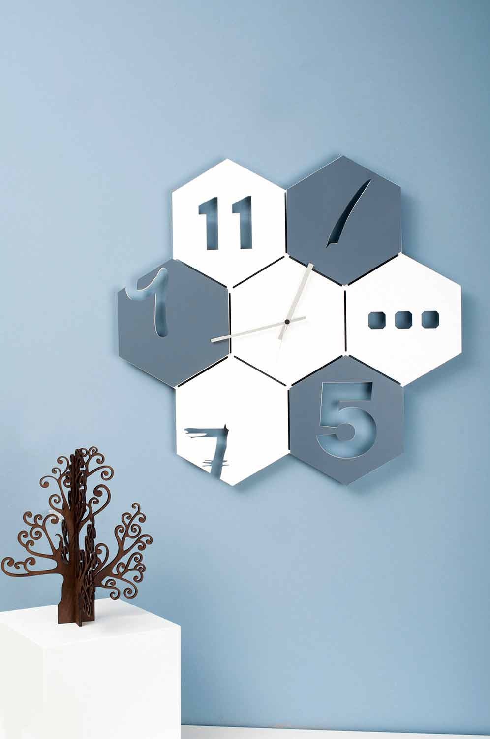 Stort vægur, design bestående af sekskanter i hvidt og farvet træ lavet i Italien.