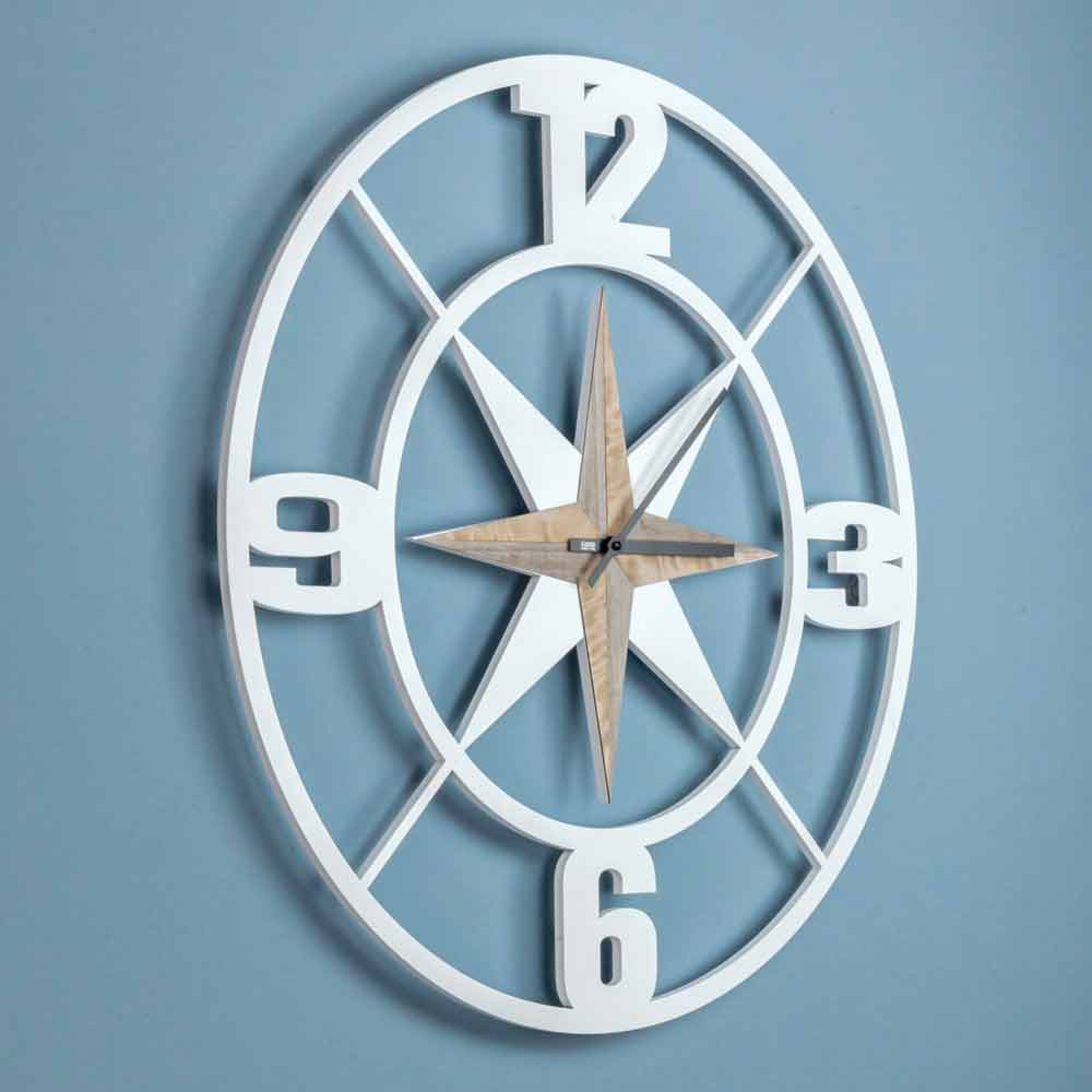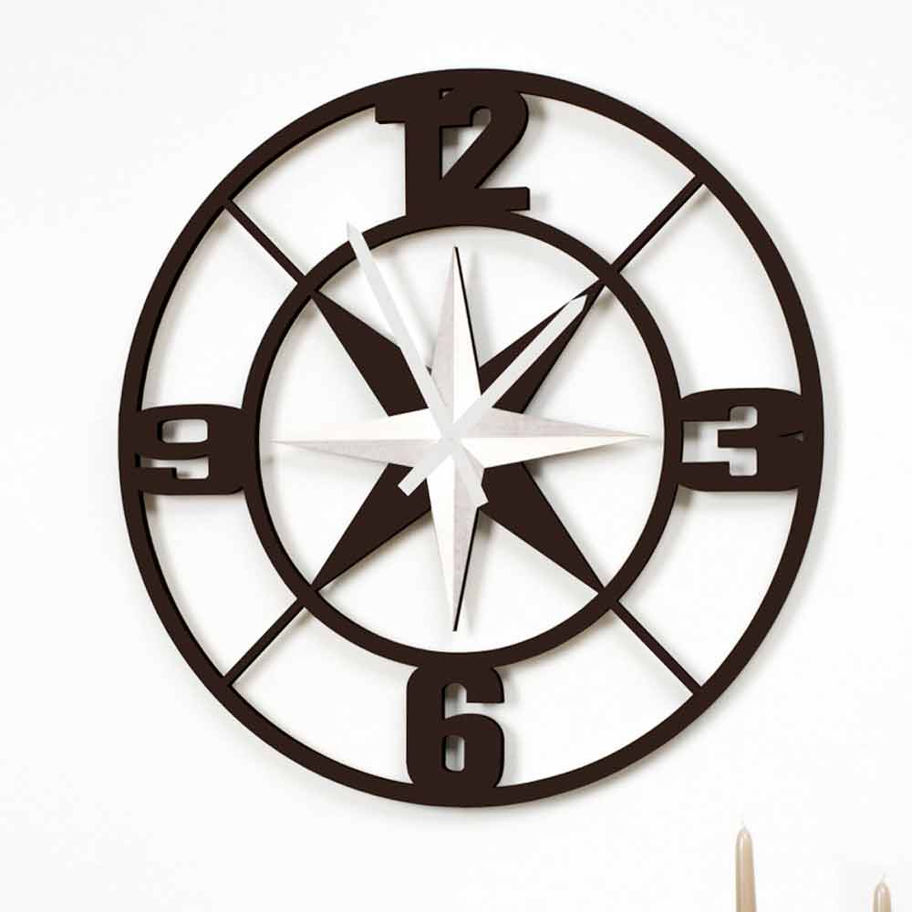 Stort vægur i lurvede stil, rundt design i hvidt og brunt træ, lavet i Italien.