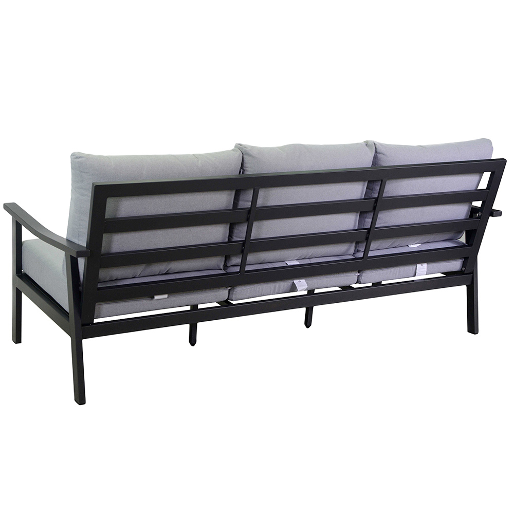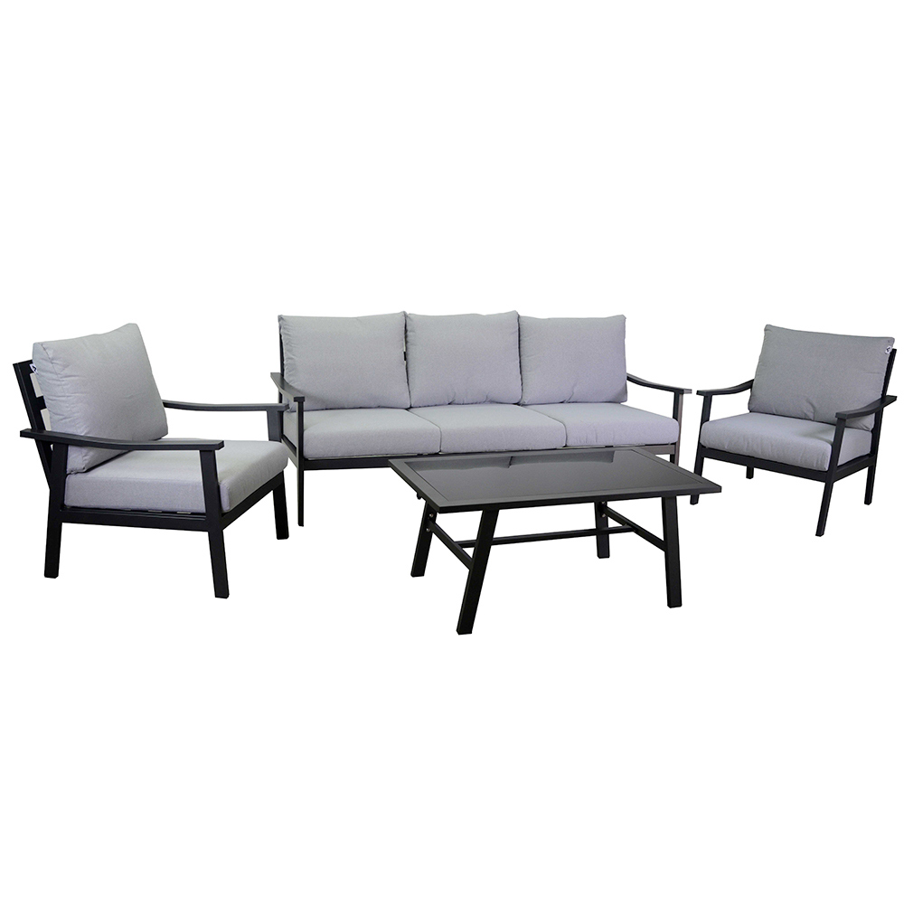 Ensemblet fuldendes af et centerbord med glastop, perfekt til drinks og snacks, hvilket gør dette sæt til midtpunktet i enhver udendørs social sammenkomst. Loungens minimalistiske og moderne design passer perfekt ind i ethvert udendørs rum og tilføjer et strejf af moderne stil.