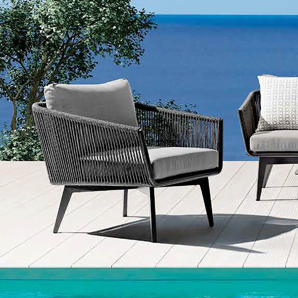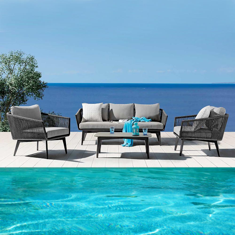 Denne havelounge er et perfekt eksempel på moderne elegance designet til at leve udendørs med stil og absolut komfort . Den malede aluminiumsstruktur , solid og let, tegner moderne og raffinerede linjer, mens den laterale rebvævning giver bevægelse og visuel lethed, hvilket gør det hele sofistikeret og imødekommende.