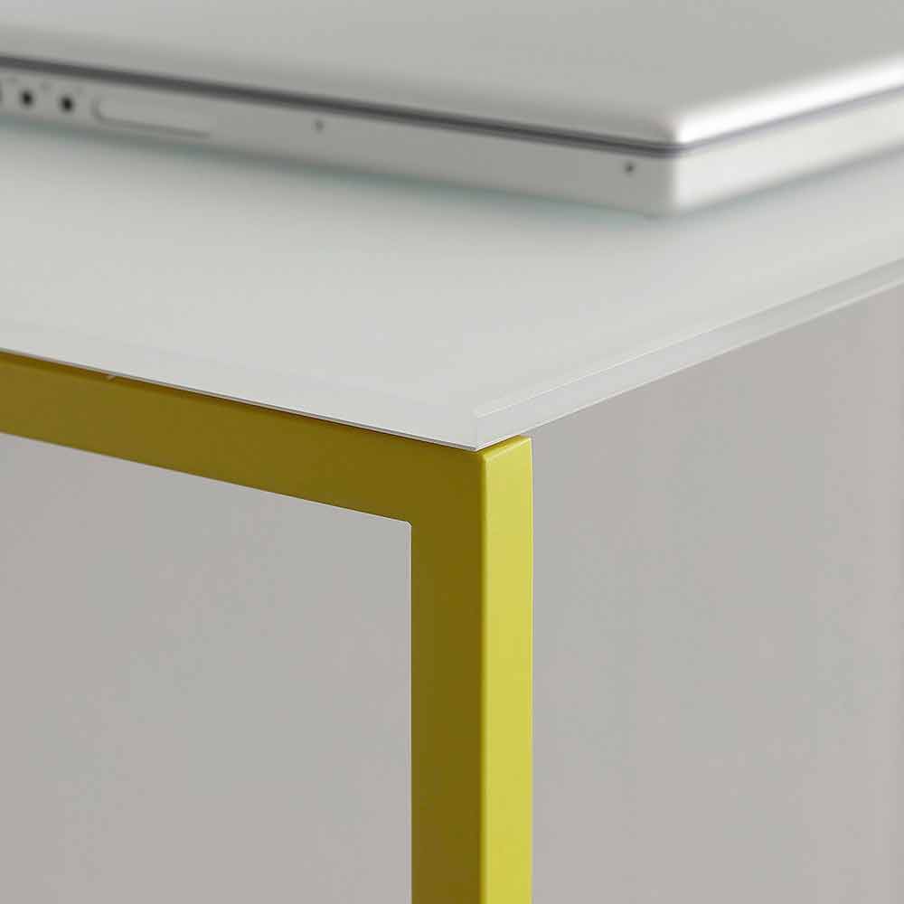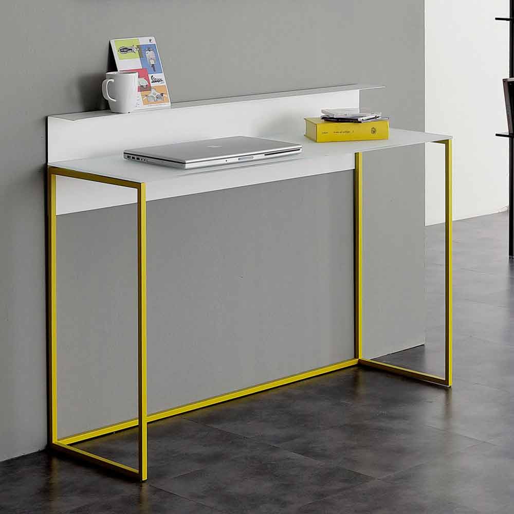 Stue konsol lavet i Italien med blank hvid glasplade komplet med hvid backsplash og gulmalet metal struktur . Enkle og væsentlige linjer giver et møbel liv med en sober og alsidig æstetik, der er ideel til at revolutionere stilen på dine værelser med et strejf af kreativ og avantgardistisk farve. Muligheden for at vælge mellem 3 forskellige størrelser gør det muligt for konsollen at tilfredsstille ethvert behov, så du kan møblere med stil selv de mindste rum takket være den særligt smalle top, som er en ideel støtteflade til indgangen eller stuen, men som gør dette perfekt supplement til brug også som et praktisk skrivebord. Den excentriske og livlige farve, der karakteriserer hele basen, giver produktet sin friske og innovative personlighed, der skaber en perfekt kombination sammen med det elegante element i krystallen.