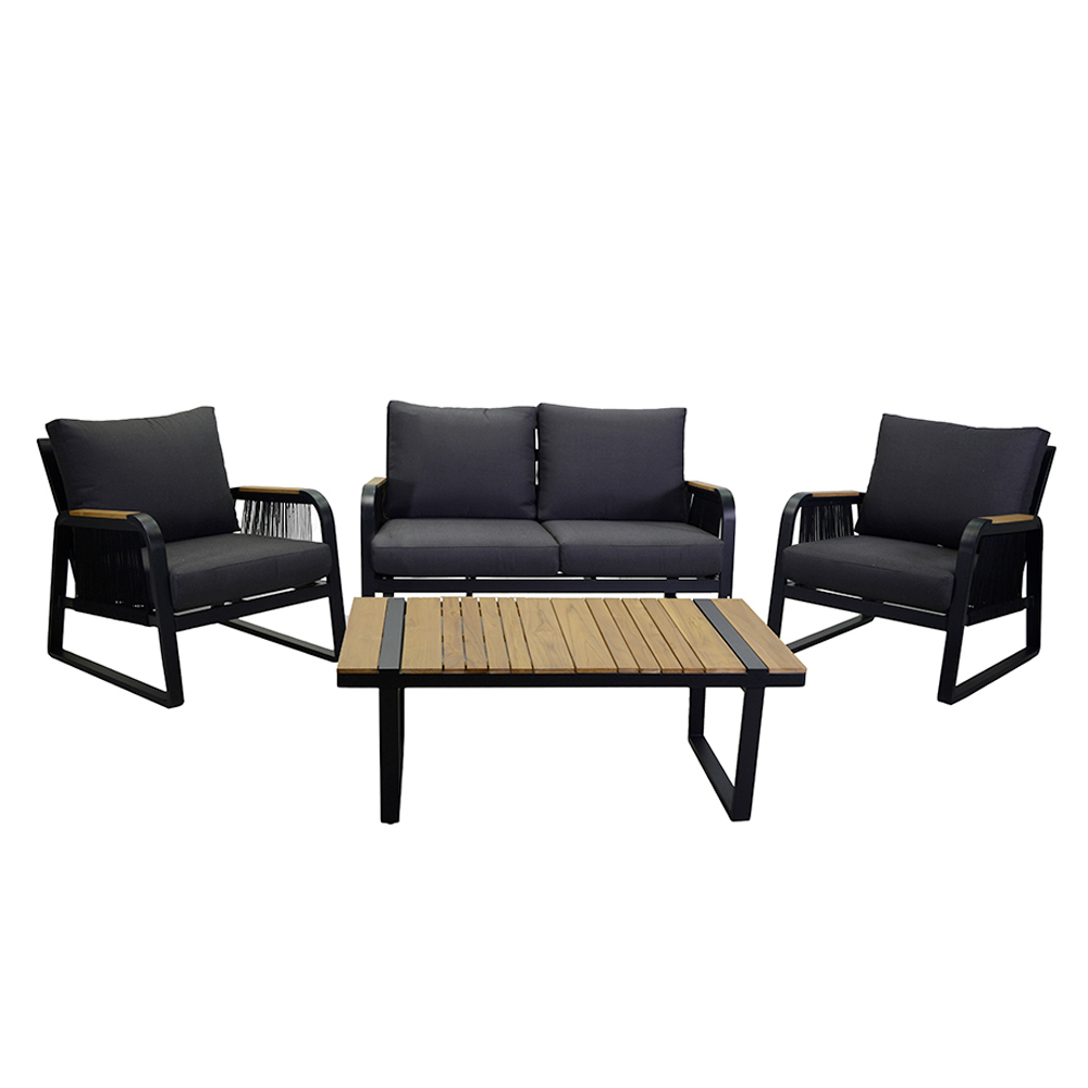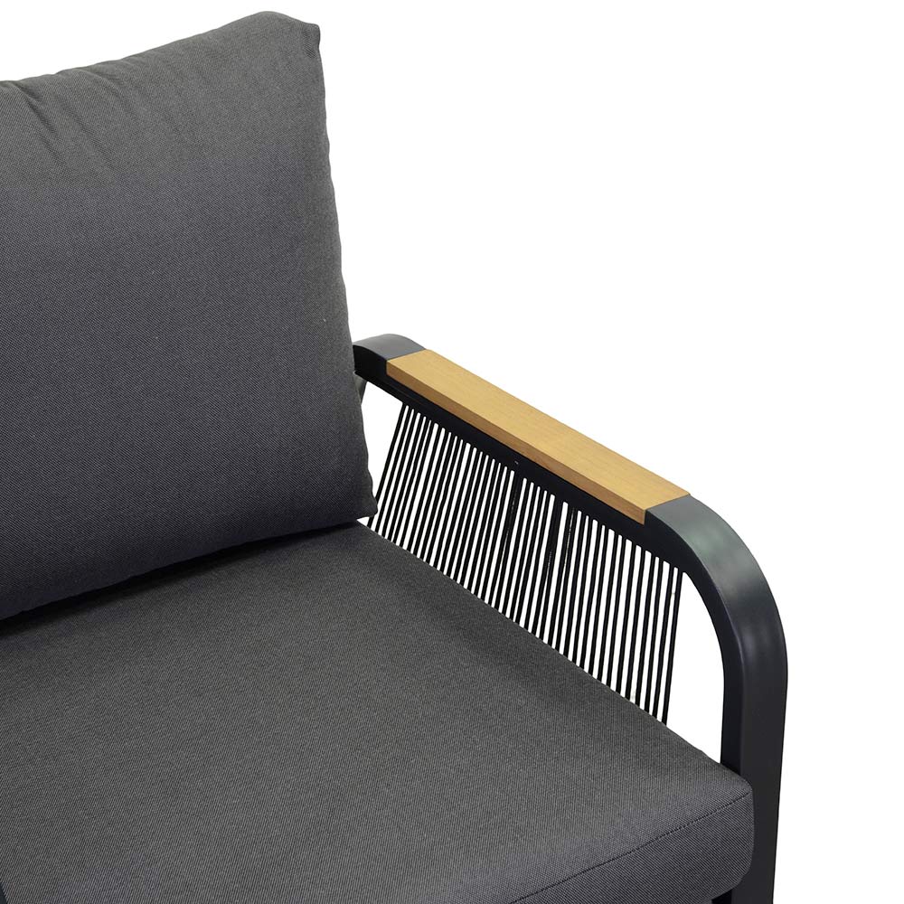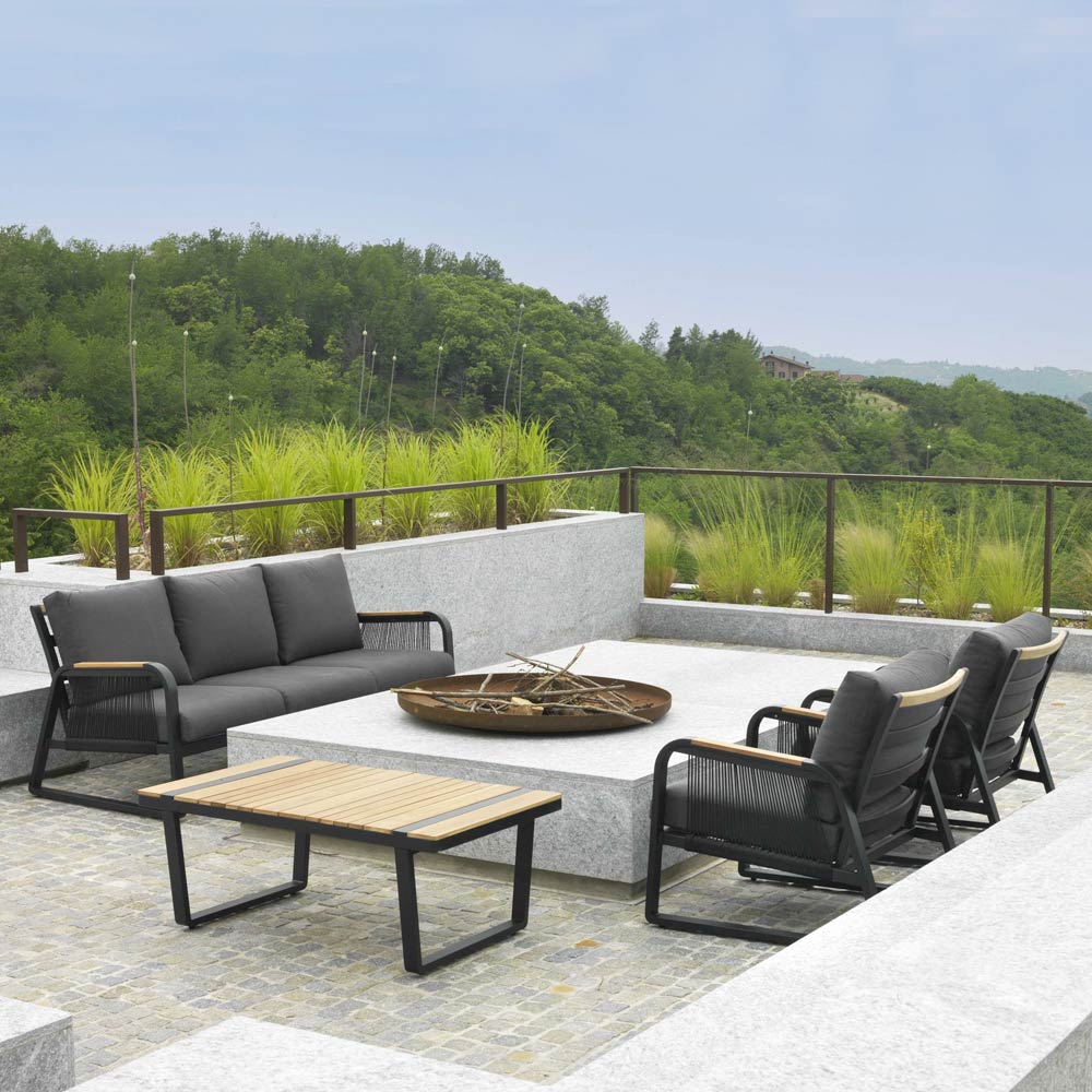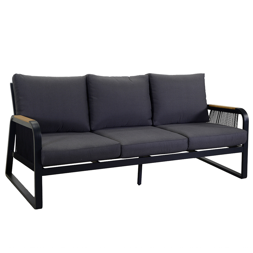 1 sofa: stel i rustfri pulverlakeret aluminium i antracitfarve, reb i vævet polyester i antracitfarve, vandafvisende hynder i mørkegrå polyester, aftagelige betræk og armlæn i TEAK-træ fra Brasilien