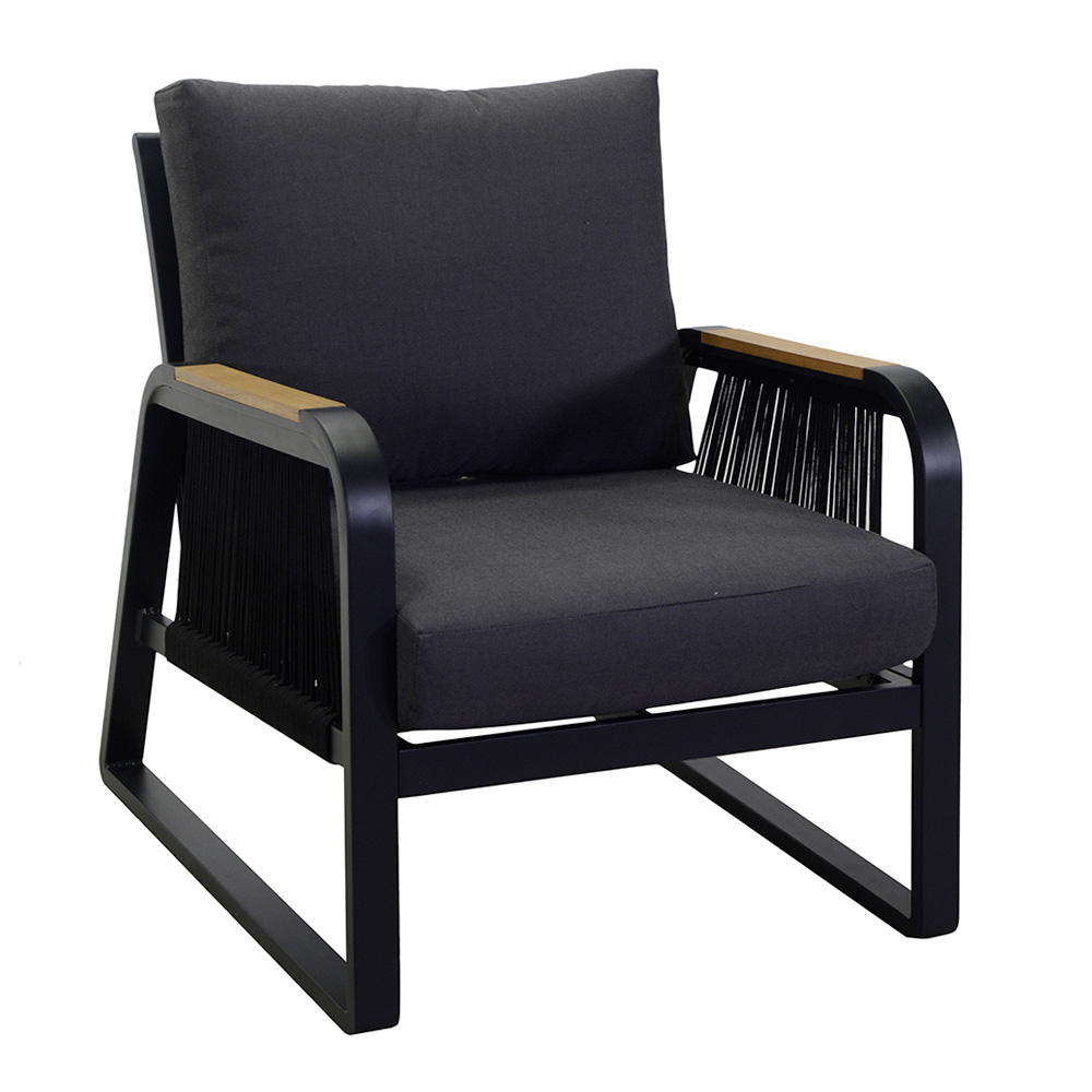 2 lænestole: stel i rustfri pulverlakeret aluminium i antracit, reb i vævet polyester i antracit, vandafvisende hynder i mørkegrå polyester, aftagelige betræk og armlæn i TEAK-træ fra Brasilien