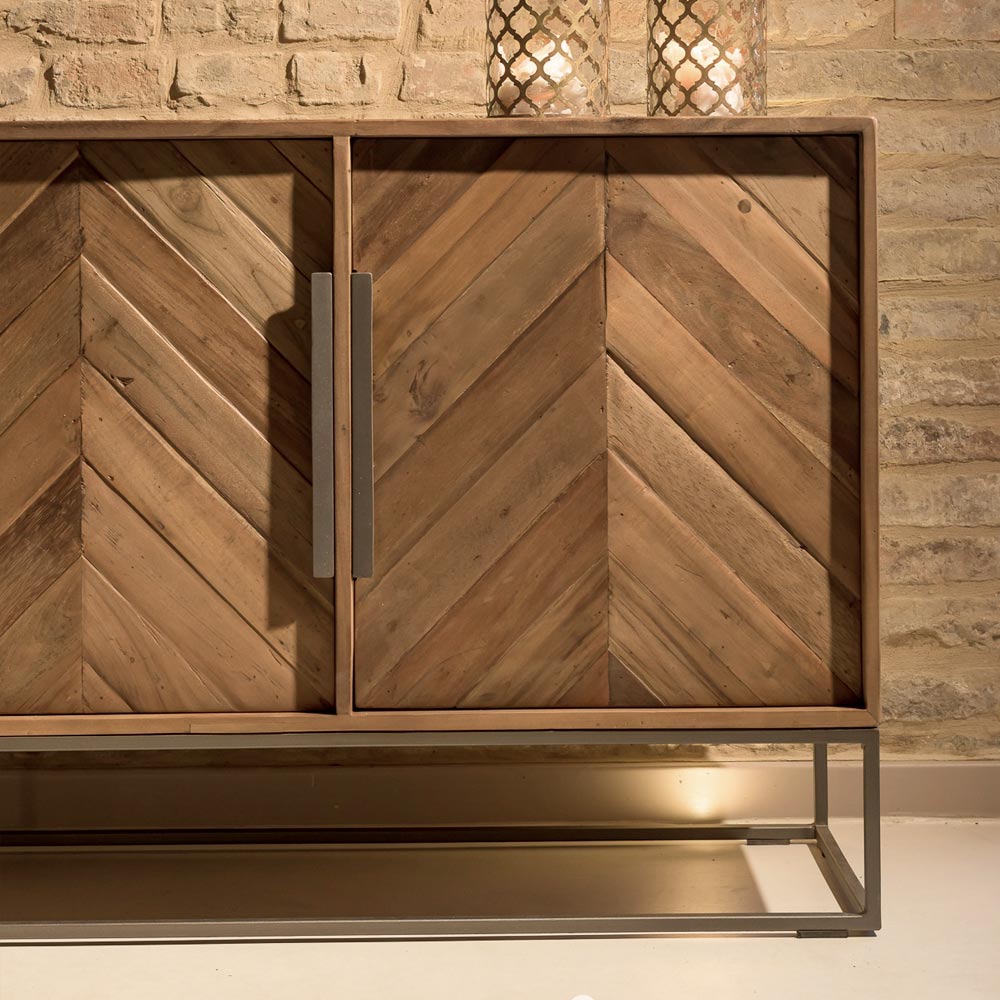 Indendørs skænk lavet af naturligt kaffefarvet genbrugstræ med 4 sildebensdøre og metalfødder .