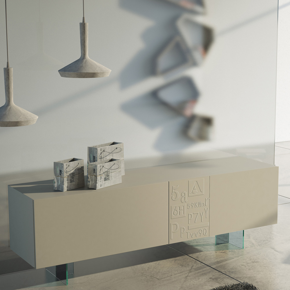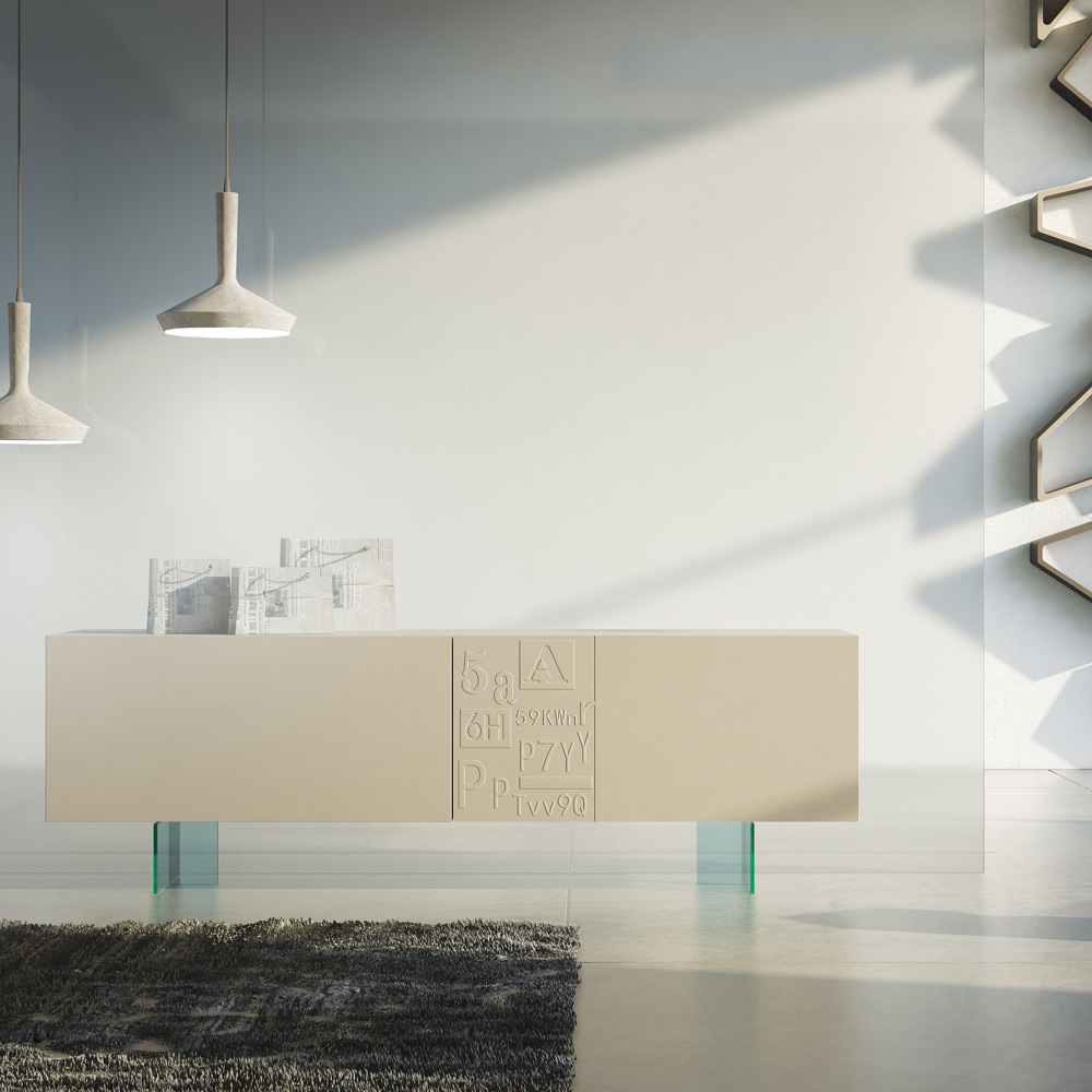 Moderne skænk med alpaca grå matlakeret MDF struktur sammensat af 2 koplanære skydelåger som garanterer stor funktionalitet og funktionalitet og med glasfødder , der giver en masse stabilitet. Dette produkt er fuld af smag og design takket være dets elegante og raffinerede finish og den delvise basreliefdekoration af døren, som gør den unik i sin art. De forskellige materialer, der bruges til konstruktionen, giver stor kvalitet og modstand over tid, hvilket giver produktet det unikke og uforglemmelige præg.