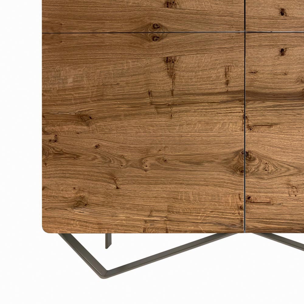 Stueskænk fuldstændig fremstillet i Italien bestående af en base med 2 jernfødder i nikkelfinish , skal i kulfinish mdf , bagside i massivt træ komplet med 4 låger i knudret eg-blokplade med country-egefinish med indvendige hylder i mdf . Brugen af enkle, men modstandsdygtige materialer forvandler dette produkt til et møbel med stor alsidighed og et attraktivt og interessant udseende.