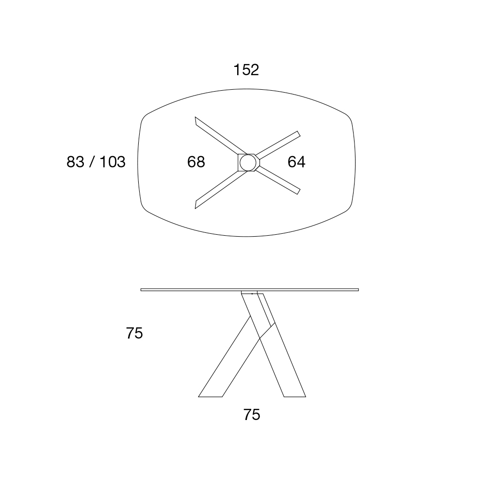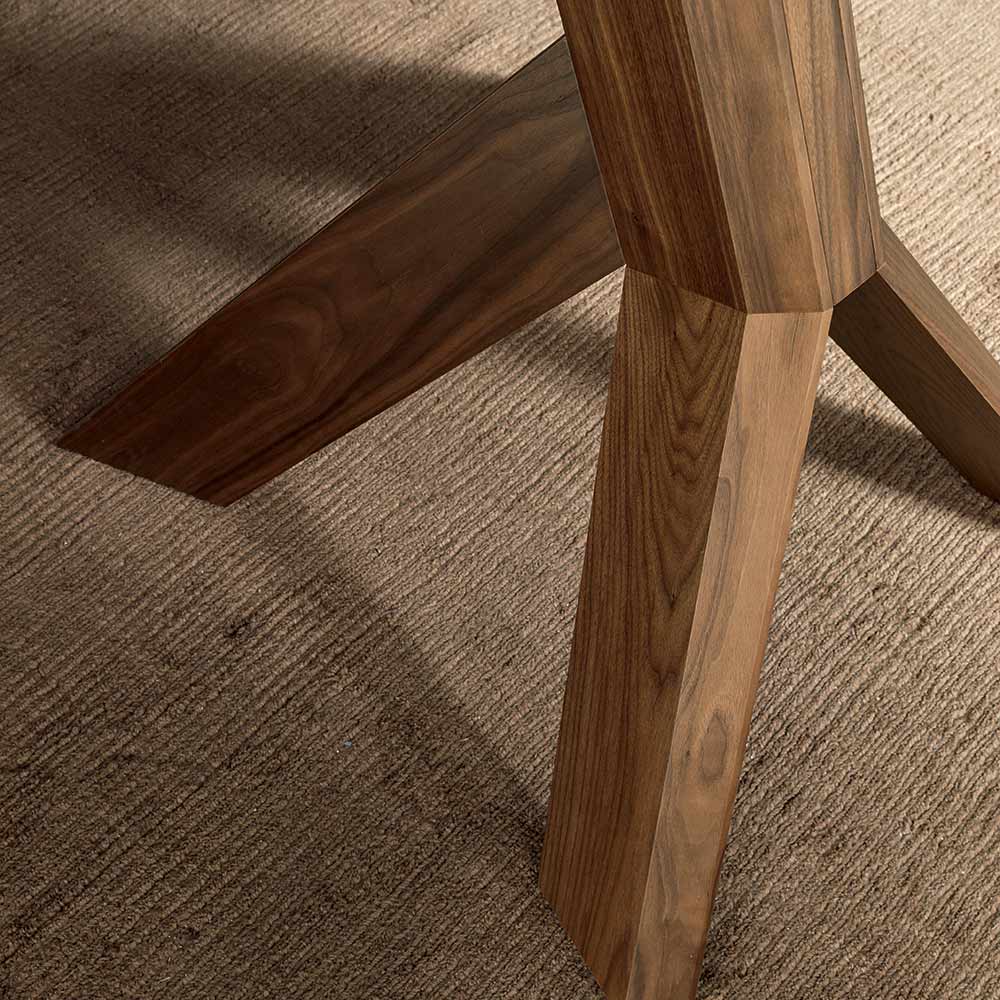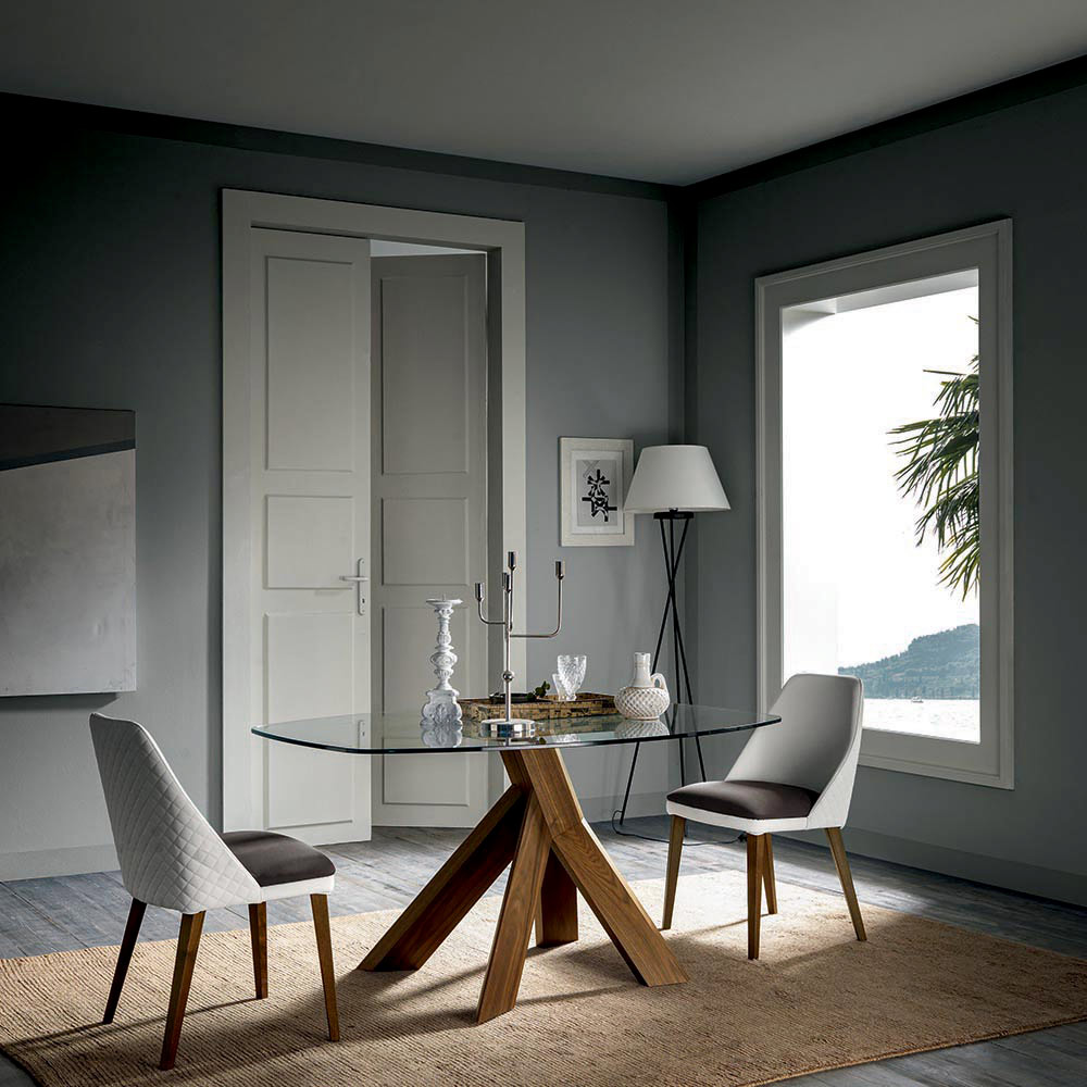 Dette spisebord har en struktur med 4 ben i fineret træ med canaletto valnød finish og en gennemsigtig hærdet glasformet tønde.