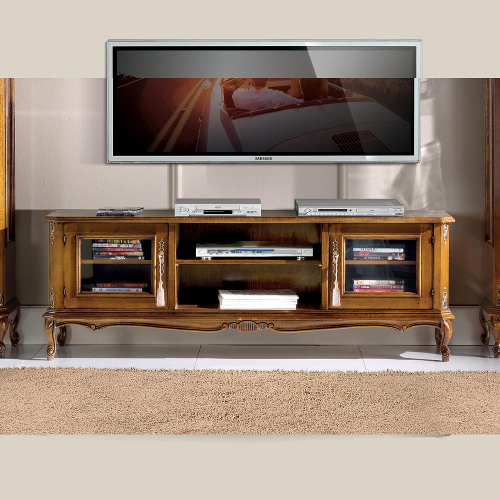 Dette TV-bord, der er designet til at give din stue et strejf af klassisk stil, er fremstillet af fint Bassano-valnødtræ. Dette praktiske møbel har to døre og to rum. Det er unikt og raffineret, og det er udelukkende fremstillet i Italien og håndlavet af dygtige håndværkere , færdiggjort med dygtighed og elegance. Produktionsprocessen bruger materialer af høj kvalitet og udføres i hånden med den største omhu og professionalisme, der kendetegner Made in Italy -produkter.