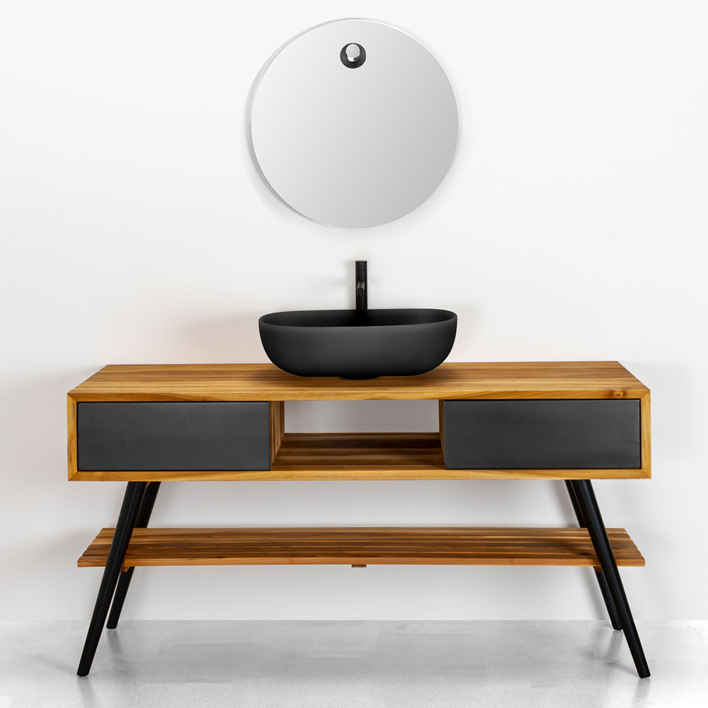 Badeværelsesmøbelsammensætning med rundt spejl og sort harpiksvask.