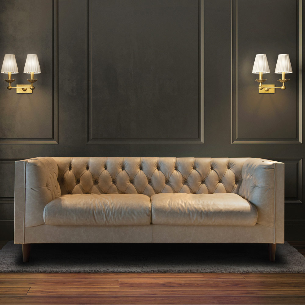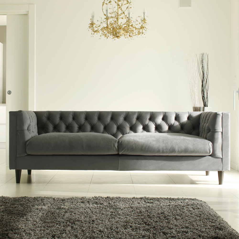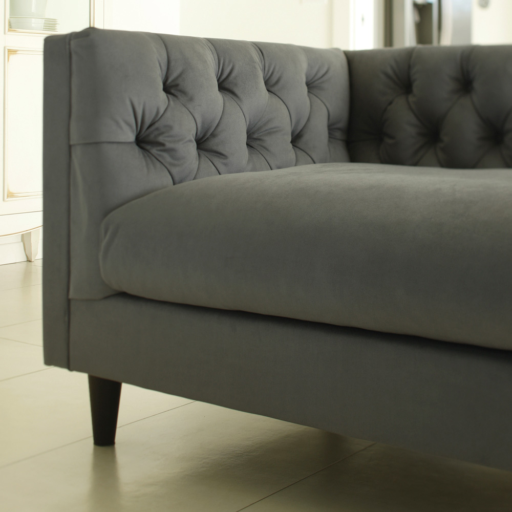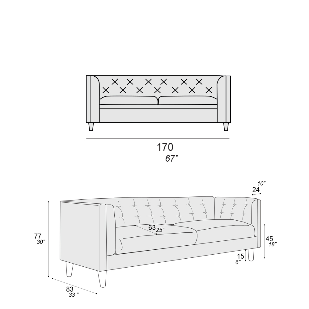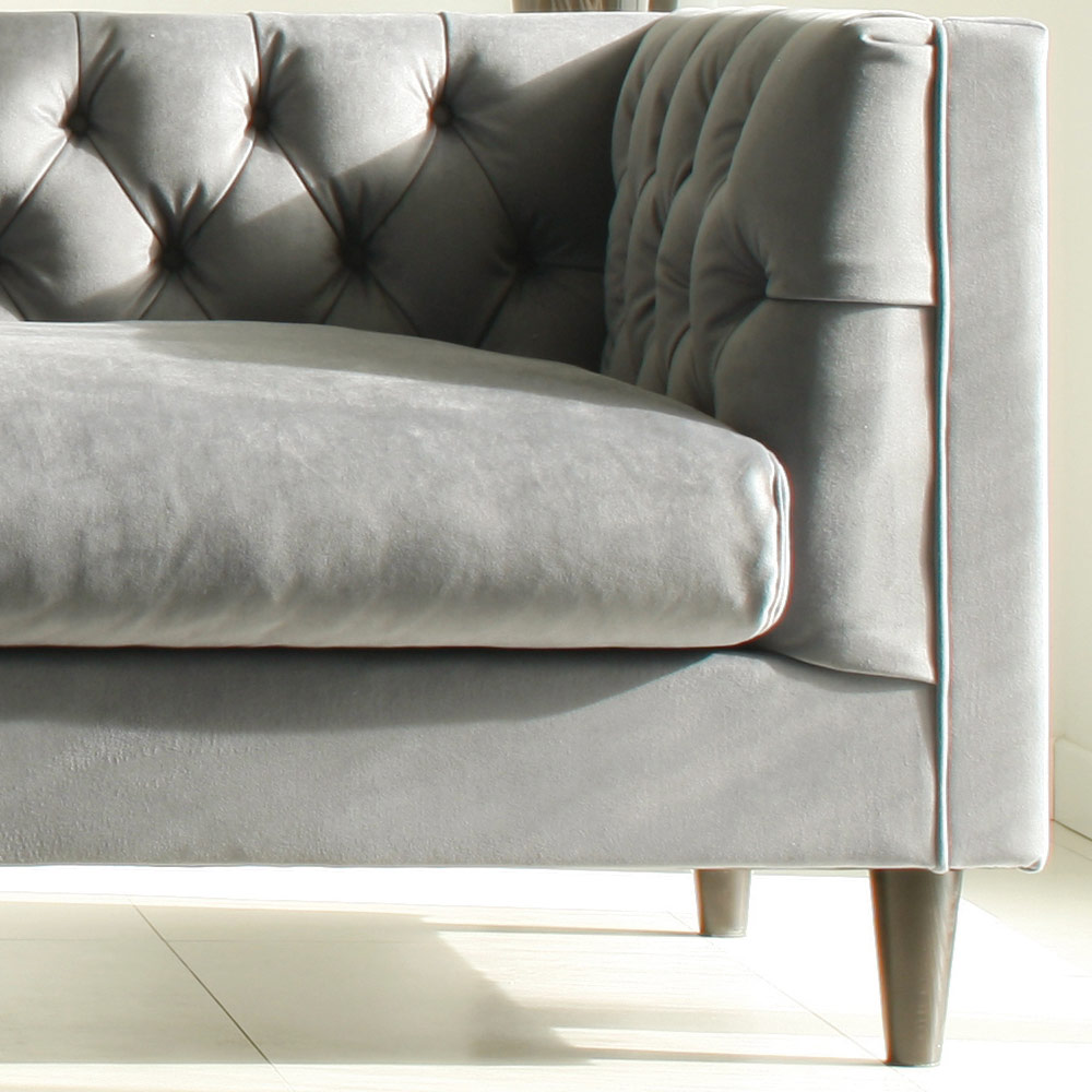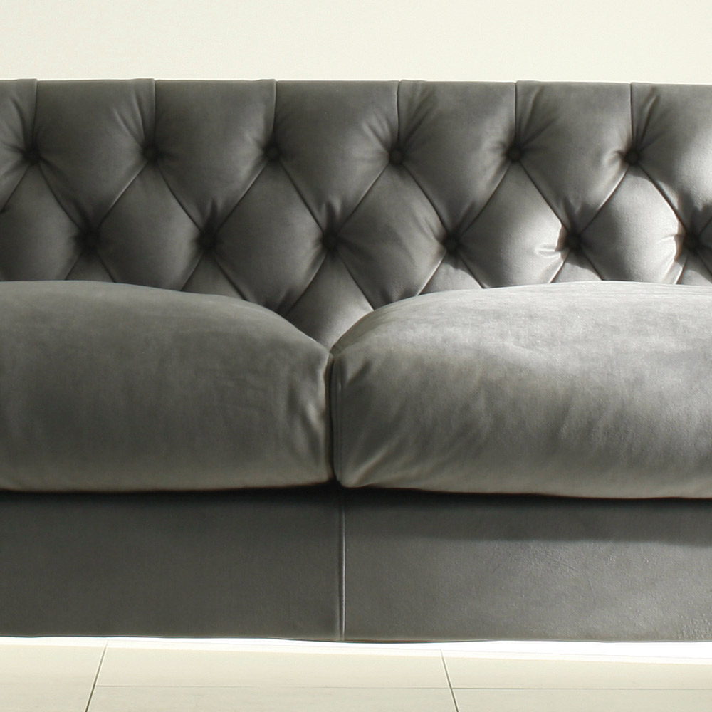 bøgetræ. Sofaen kombinerer klassicisme med et moderne og raffineret look. Dens knappede tufter og afrundede armlæn fremkalder elegance, mens trærammen og den generøse polstring sikrer komfort. Kvalitetspolstringen, der fås i forskellige farver, beriger sofaens udseende. De tynde træben tilføjer et moderne touch, hvilket gør sofaen velegnet til både traditionelt og moderne interiør, hvilket giver den en hyggelig og sofistikeret atmosfære.
