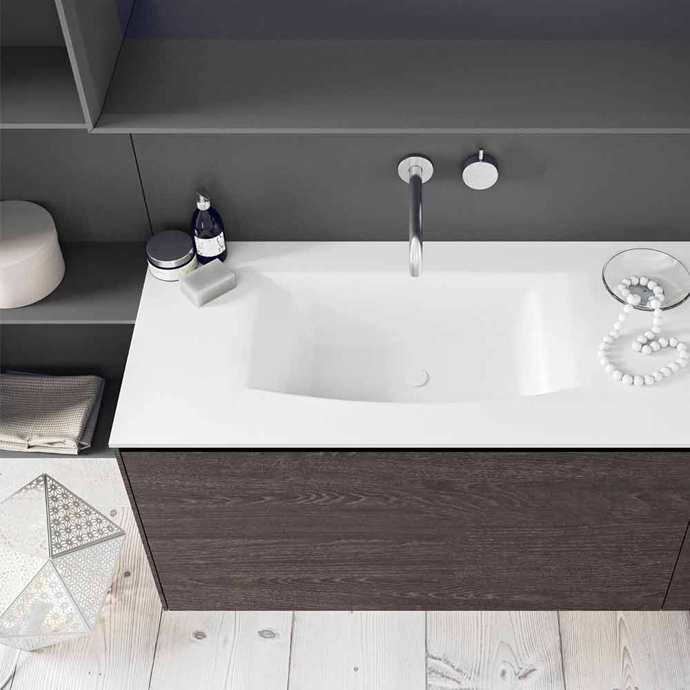 Scenen afsluttes med den indbyggede håndvask præget af to laterale sider, der forsigtigt ned mod bassinet.