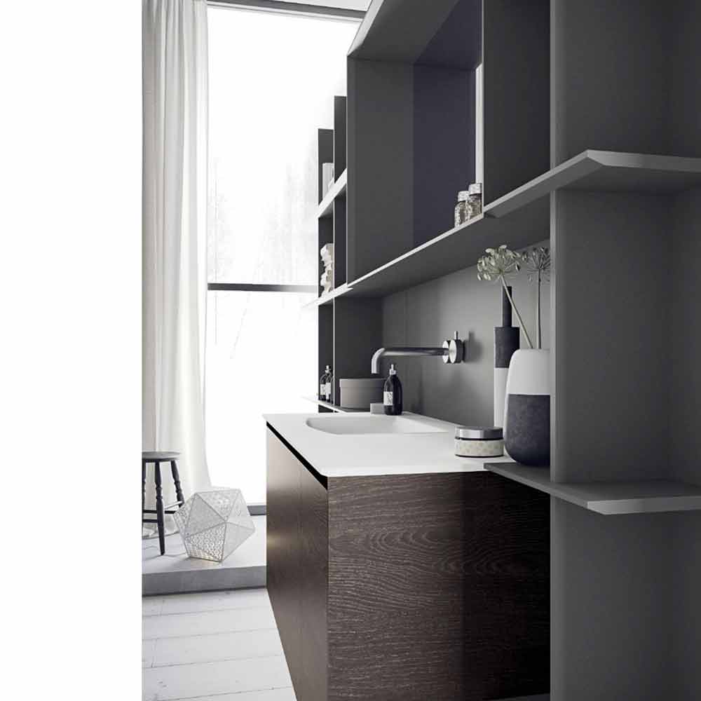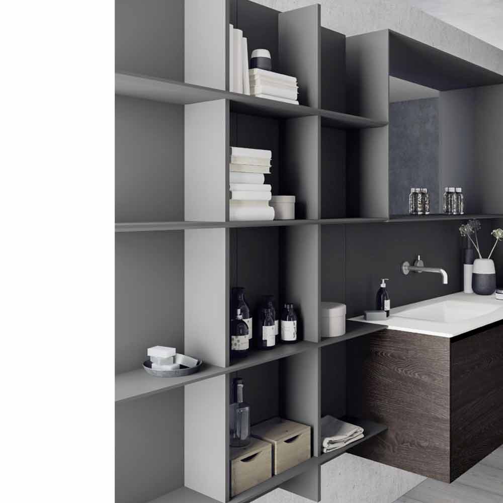 Moderne badeværelseskomposition, ophængt og regelmæssigt design med åbne hylder, fremstillet i Italien.