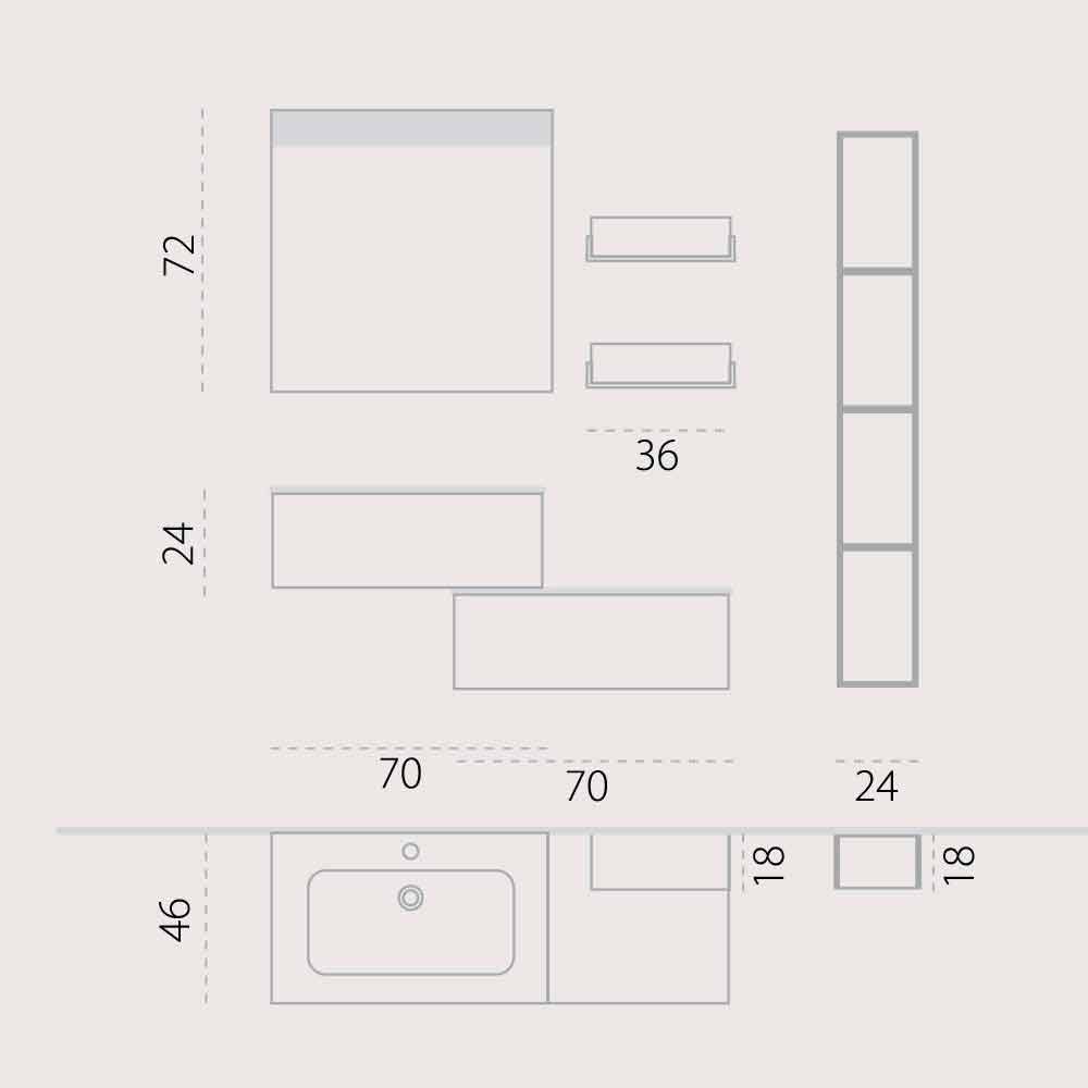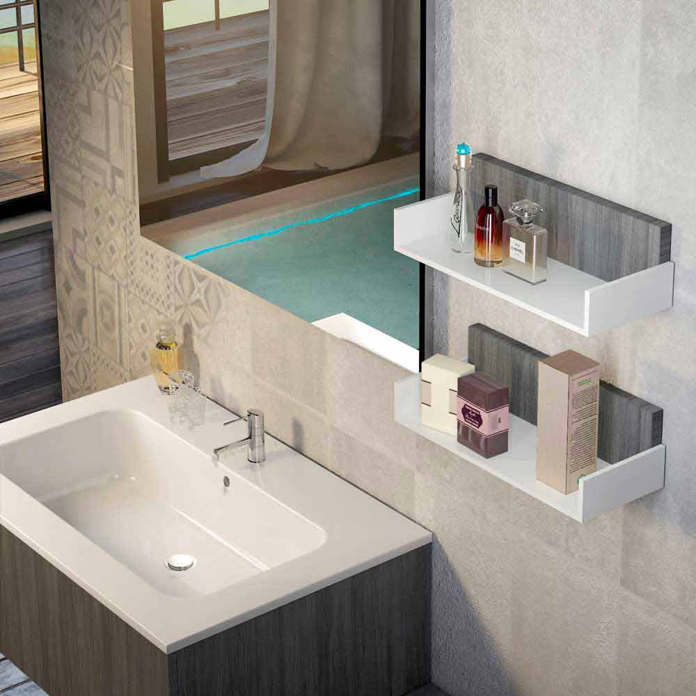 Forlì er en sammensætning af ophængte badeværelsesmøbler af økologisk træ, fuldstændig genbrugt og dækket med giftfri plastlaminat, der perfekt gengiver naturlige farver og trækorn. Derudover giver det en satinlakeret finish på Mdf-komplementerne mulighed for at opnå en blød og meget naturlig linje med ikke-toksiske og opløsningsmiddelfrie maling.