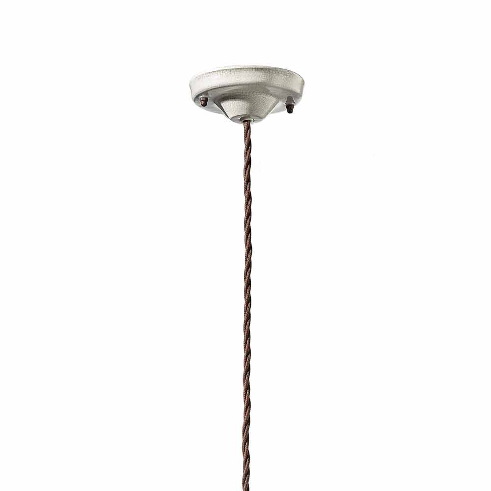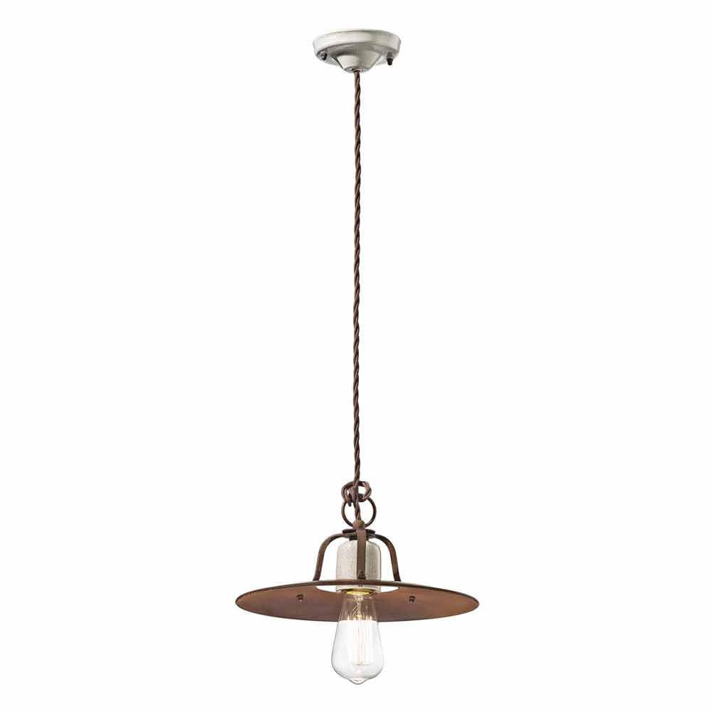 Bred krone og let justerbar højde takket være det flettede kabel, der fuldender den industrielle stil. Matt rust metal og keramiske detaljer for at fuldende en balance mellem fulde og tomme former. Den er inspireret af den amerikanske rustikke stil. Denne lampe er med sine dunkle farver og en indlevet smag enkel og tidløs. Rent lys uden afskærmning.