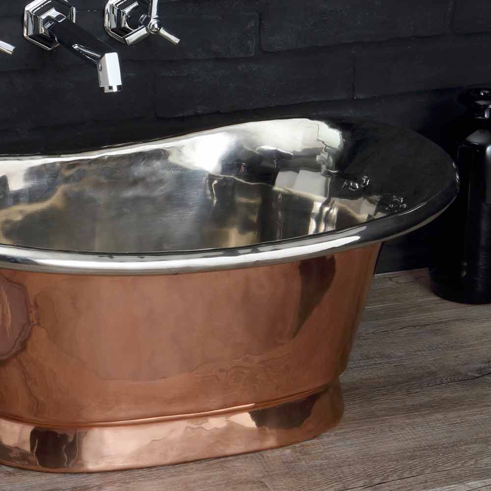 Bordvask til badeværelset fuldstændigt lavet af kobber, med indvendig finish i poleret nikkel og udvendig finish i kobber, helt håndlavet. Håndvask i vintage stil, der kombinerer skønhed og elegance, giver et strejf af klasse til dit hjem!