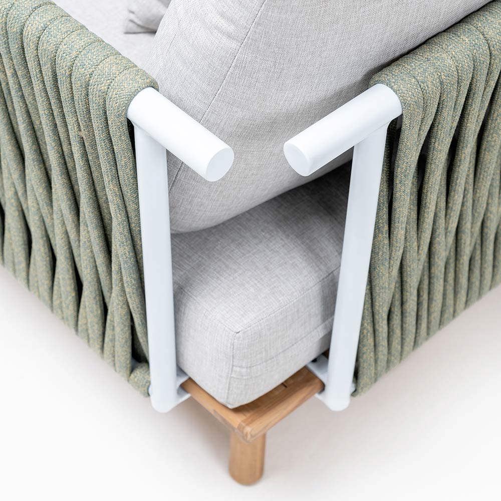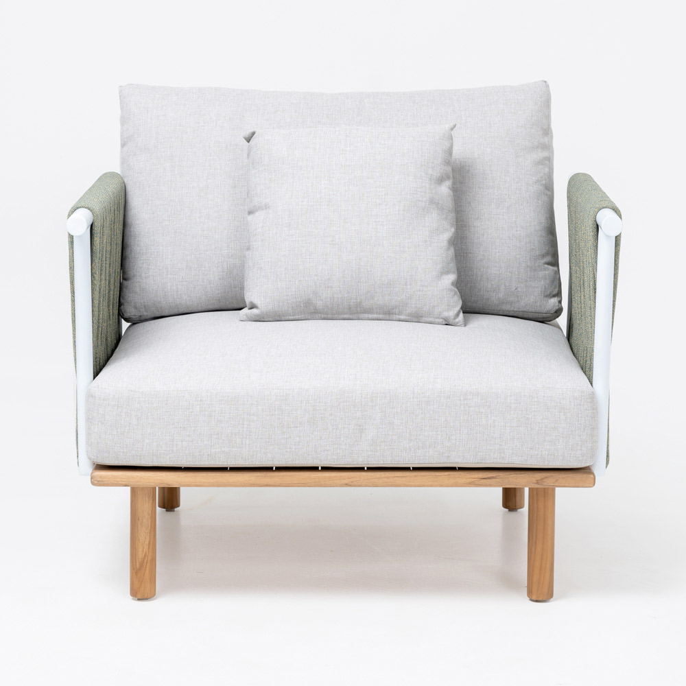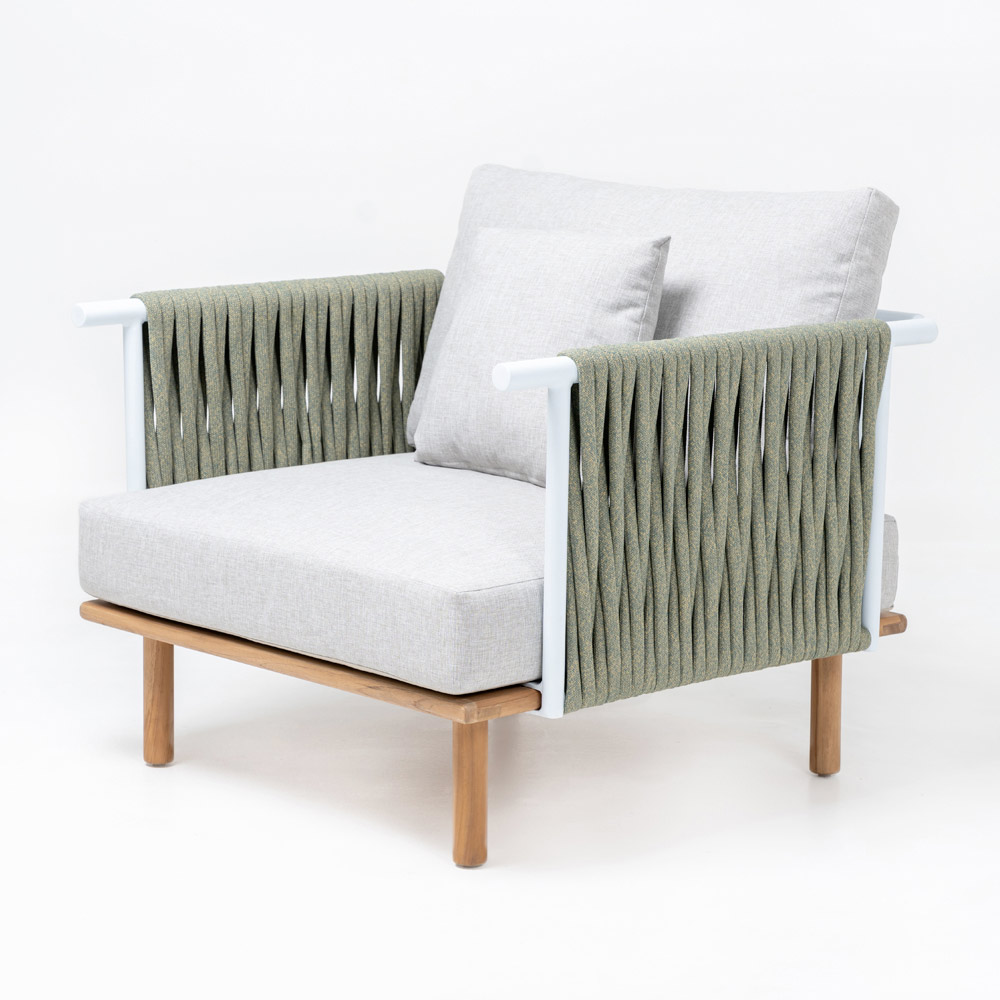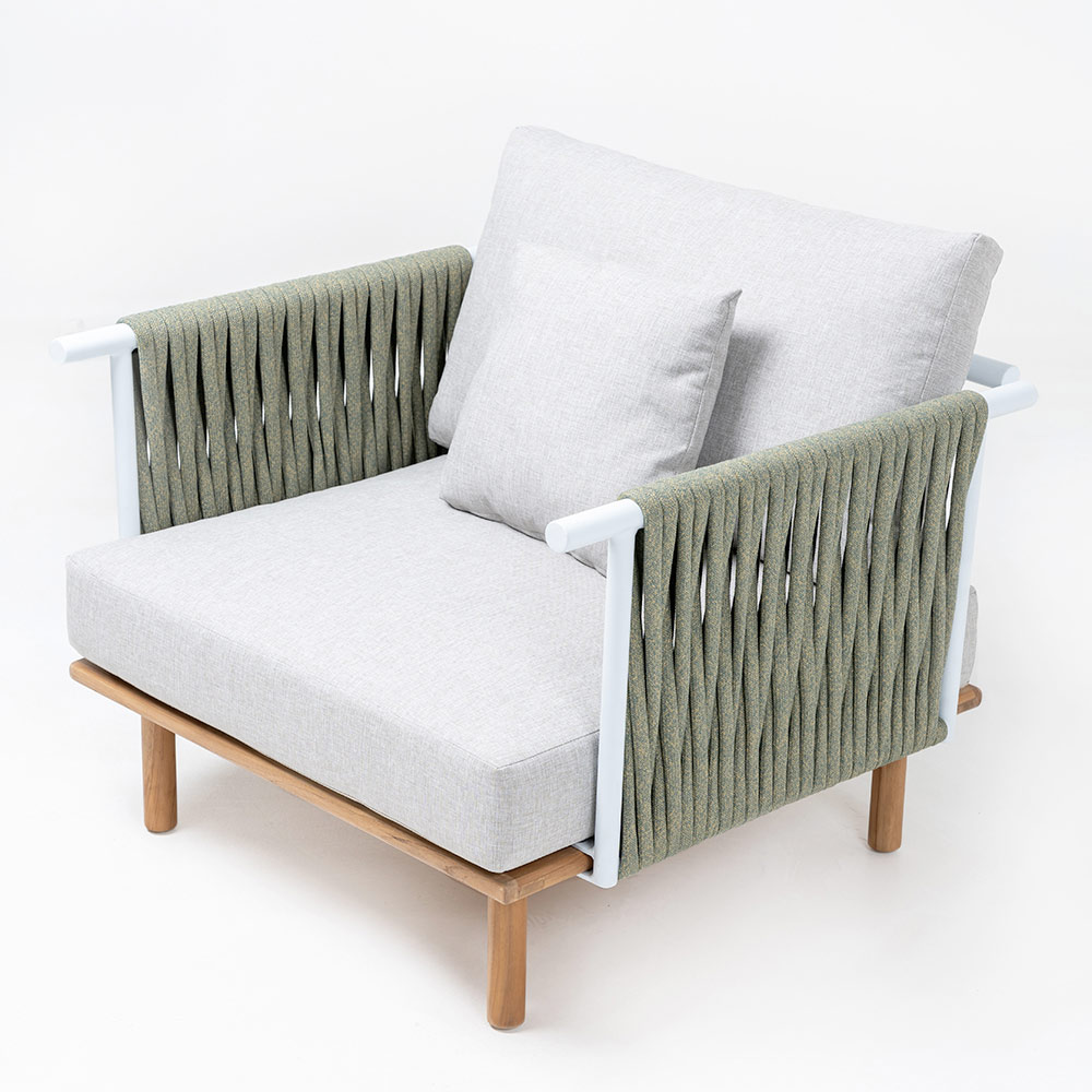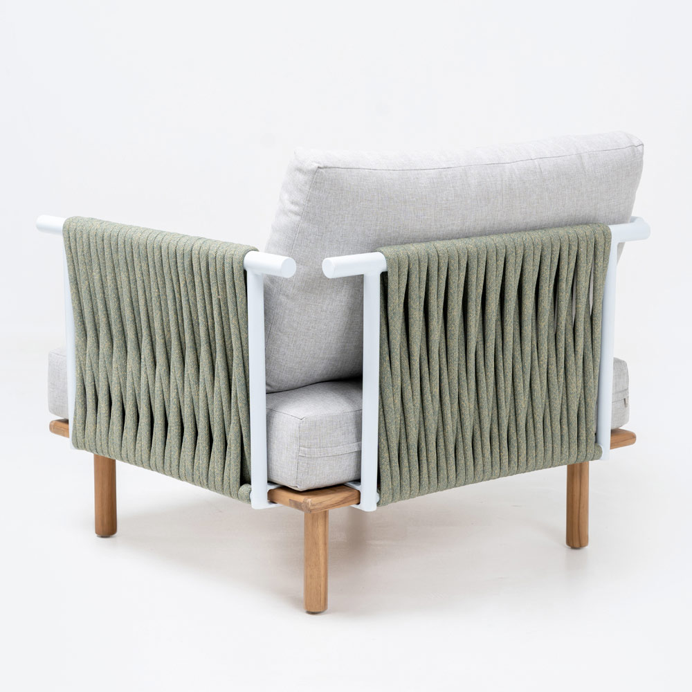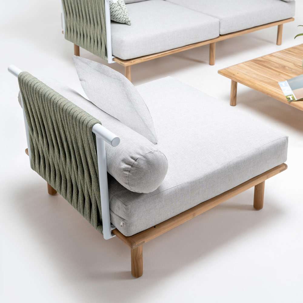 Lænestol i teaktræ, aluminiumsryglæn og Olefin/PP ROPE-vævning og -hynde