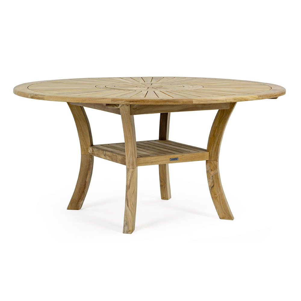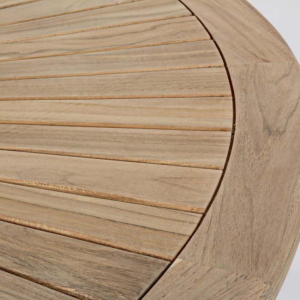 Kvalitets udendørs spisebord i teaktræ med central drejetop.
