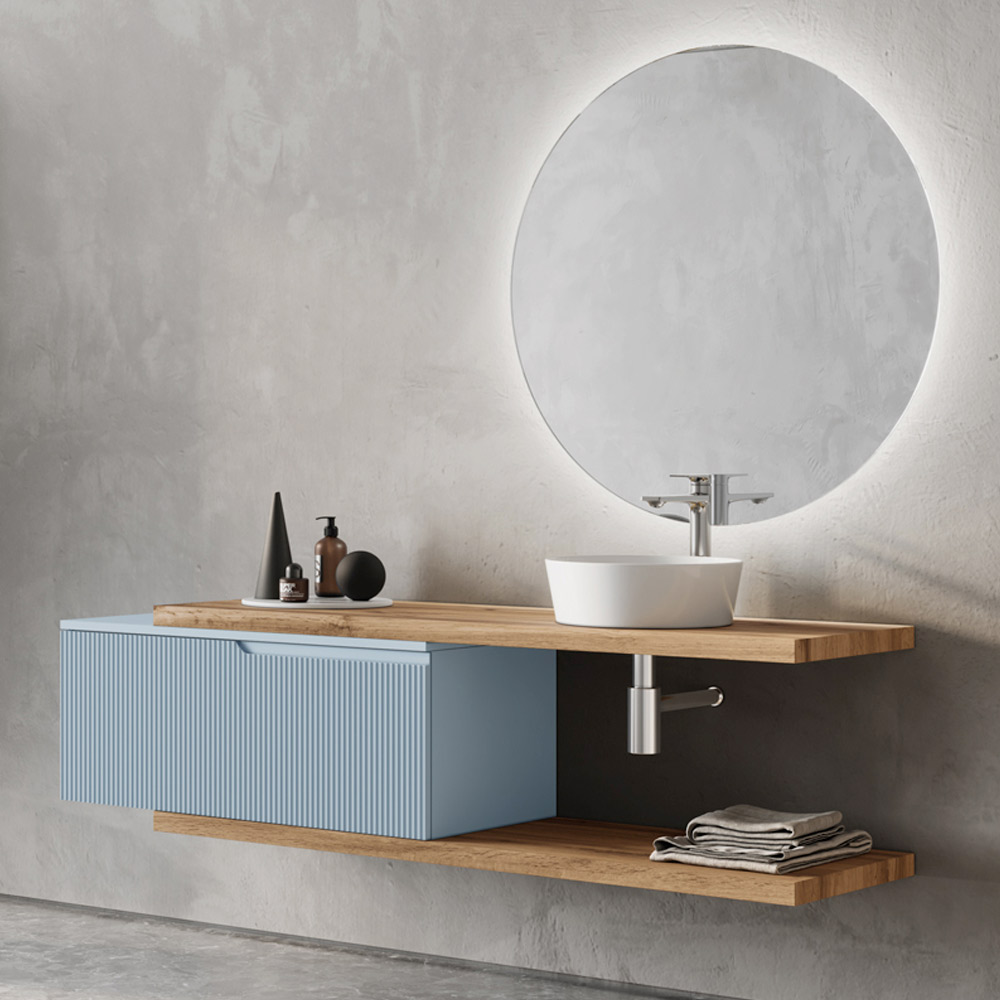 Badeværelsessammensætning i Tiffany blå MDF og ribbet eg Fremstillet i Italien