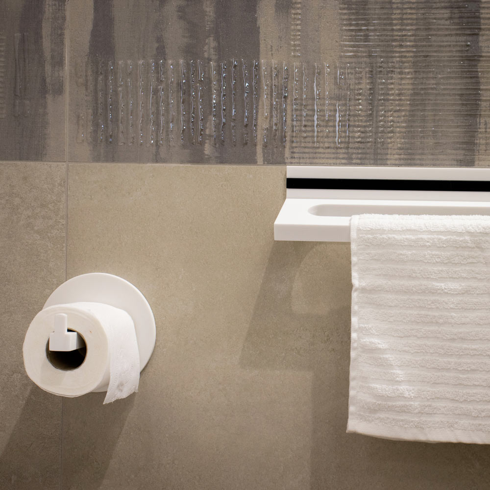 Toiletrulleholder i hvid eller hvid corian med sort designindsats, lavet i italiensk kvalitet.