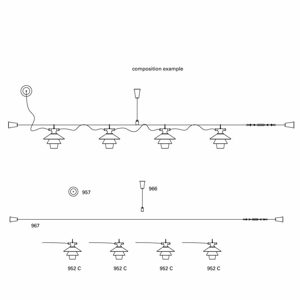 Forbindes med loftrosen artikel 970 . Takket være loftrosen er det muligt at skabe interessante lyssammensætninger ved at kombinere denne lampe med de andre ophængslamper i kollektionen: 951, 954-22 og 952.