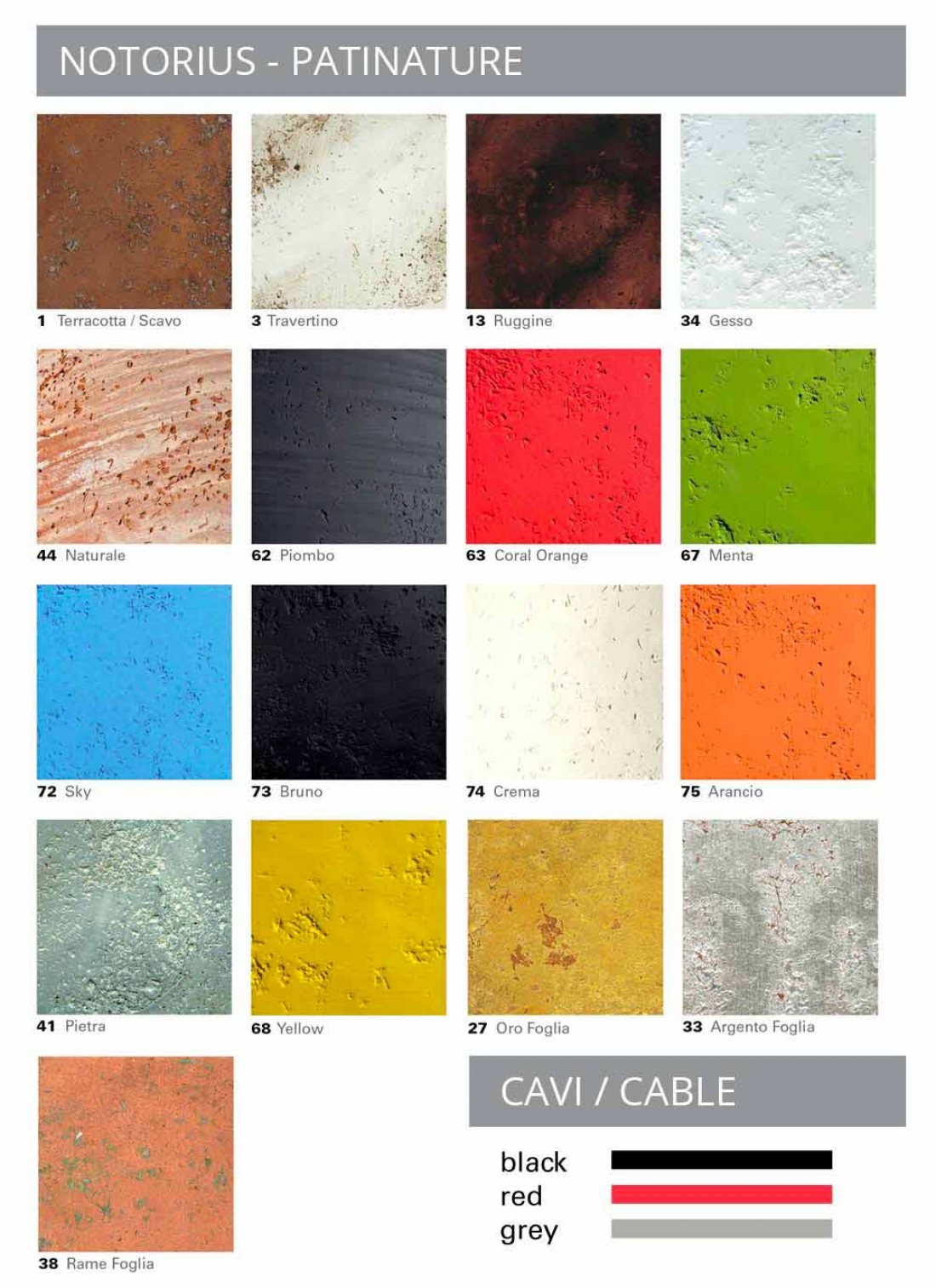 Bemærk venligst: Lampe fås i forskellige kromatiske variationer, både til den udvendige finish, både til den indvendige og til skærmbilledet af det elektriske kabel. Se farvekortet og angiv de ønskede farvekoder i den relevante boks.