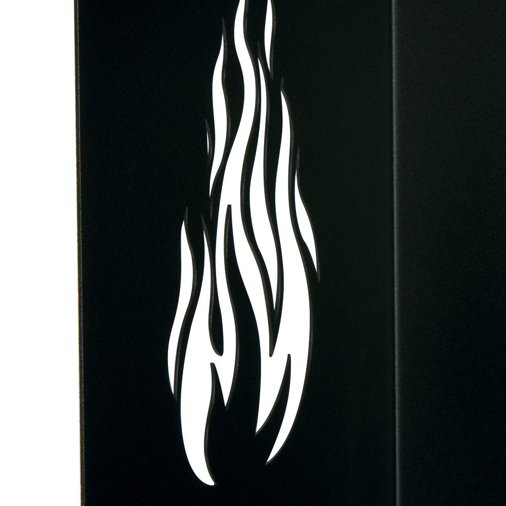 Denne brændeholder i metal kombinerer praktisk funktionalitet med et attraktivt design for at berige pladsen på din pejs. Den sorte struktur er modstandsdygtig og robust, designet til at rumme en generøs mængde træ. Flammeudskæringerne på siderne tjener ikke kun som dekorative elementer, men sikrer også korrekt ventilation, hvilket er afgørende for at holde træet tørt.