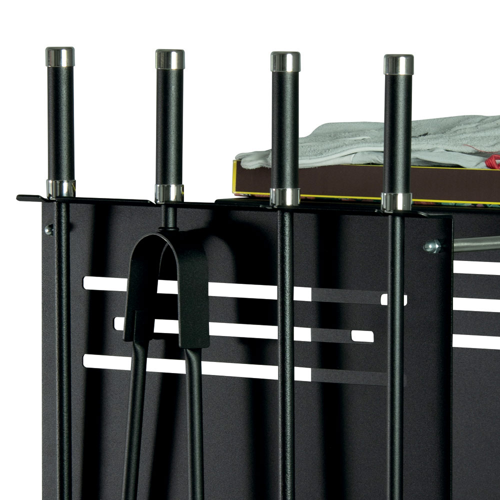Denne multifunktionelle brændeholder er et vigtigt tilbehør til pejseelskere. Den er lavet med en robust metalstruktur og er udstyret med hjul for at lette bevægelsen. Enheden tjener ikke kun til at rumme en god mængde brænde, men tilbyder også dedikeret plads til de værktøjer, der er nødvendige til brandstyring: en skovl, en børste, en klemme og en krog, og dermed opretholdes orden og funktionalitet.