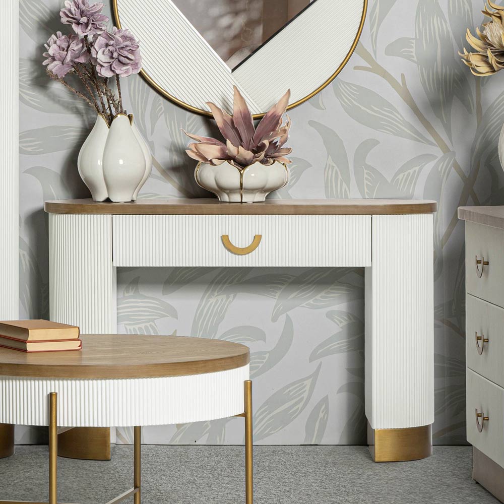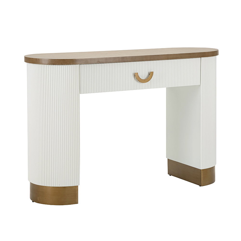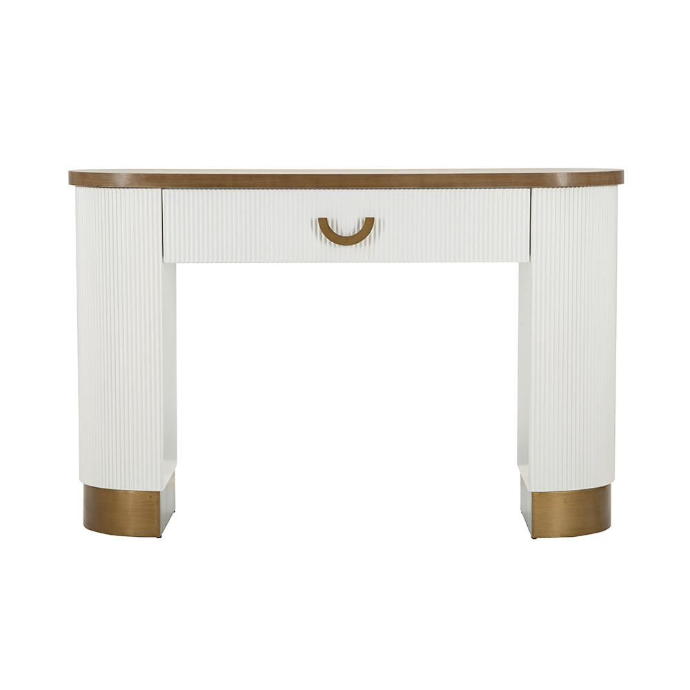 Udstyret med en skuffe er denne konsol ikke kun et objekt af bemærkelsesværdig skønhed, men også en funktionel ledsager til at organisere hjemmet. Det buede skuffehåndtag tilføjer et strejf af vintage elegance , der står i smuk kontrast til moderniteten i det overordnede design.
