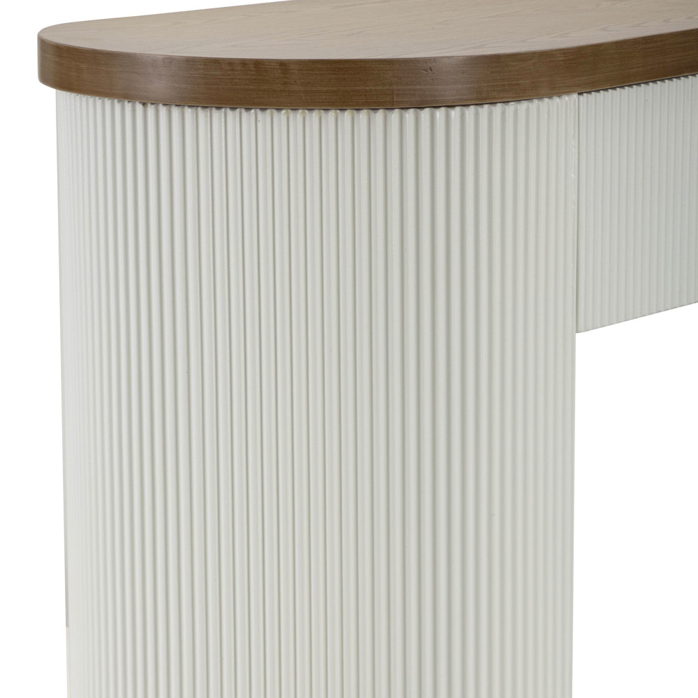 Denne halvcirkulære konsol repræsenterer en fortryllende fusion af moderne design og klassiske detaljer. Den elegante struktur, med sine rene linjer og varme tonede MDF-overflader, står i harmonisk kontrast til blødheden af de lodrette riller , der pryder sidepanelerne, hvilket giver en rig visuel oplevelse og en fængslende tekstur.