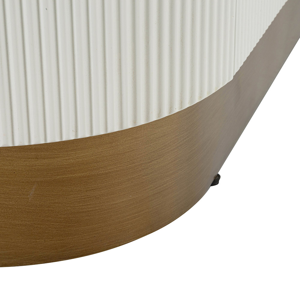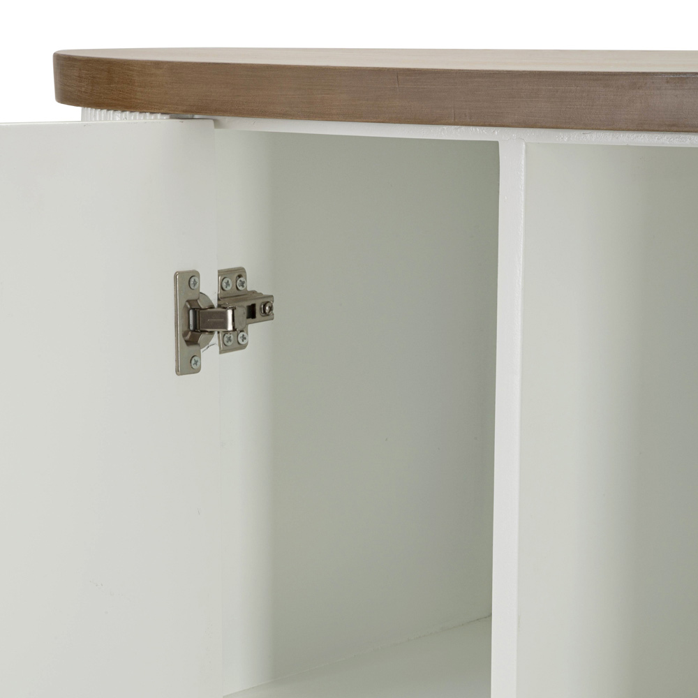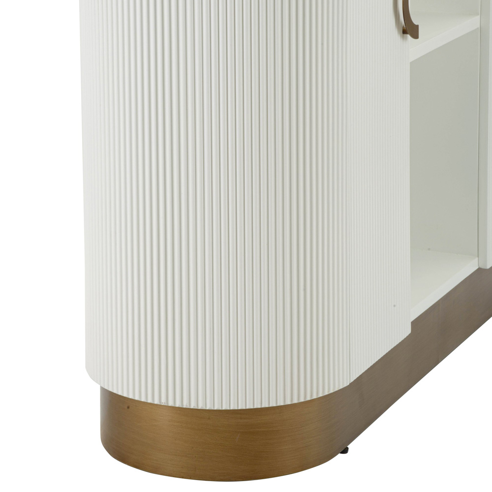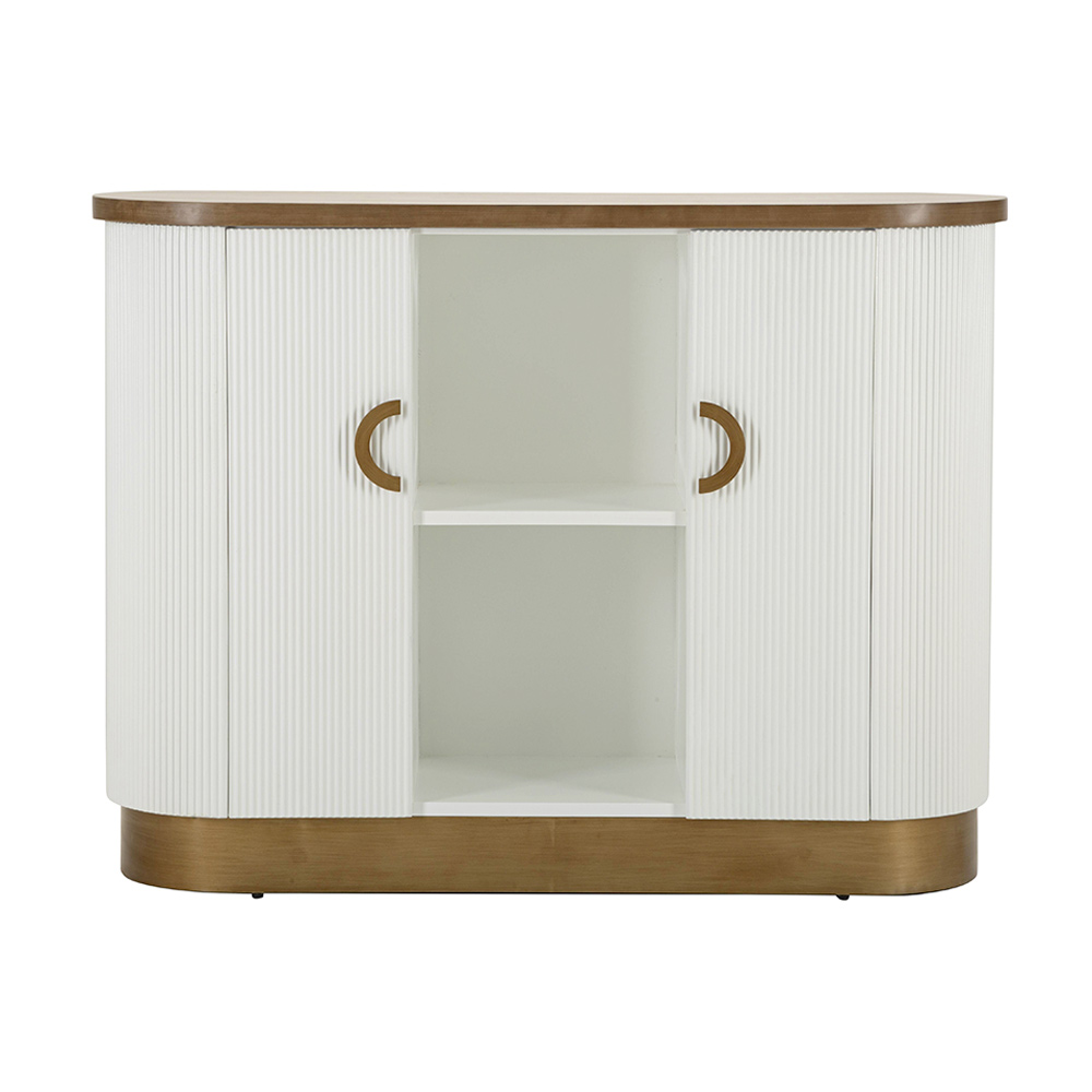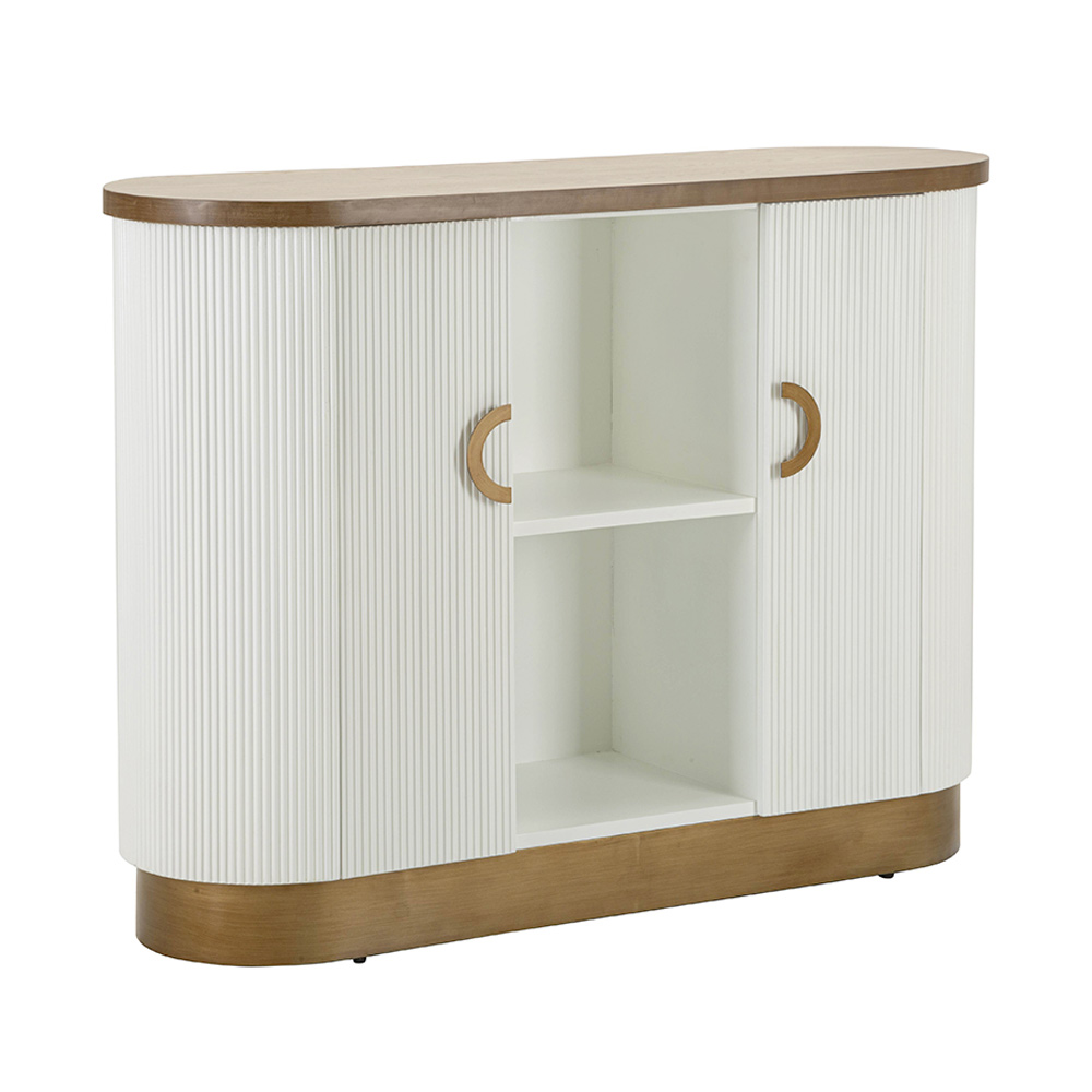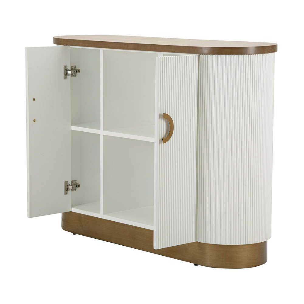 Dette krumlinjede møbel inkarnerer det perfekte møde mellem funktionalitet og sofistikeret stil . Skabets bløde silhuet og afrundede hjørner fremhæves af den varme finish, der indrammer de hvide riflede låger . Den lodrette ribbede effekt tilføjer ikke kun tekstur og visuel dybde, men fremkalder også en følelse af fornyet klassisk elegance .