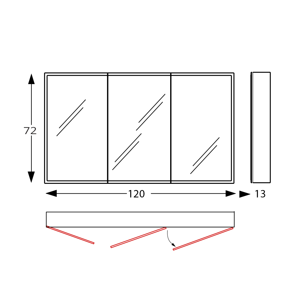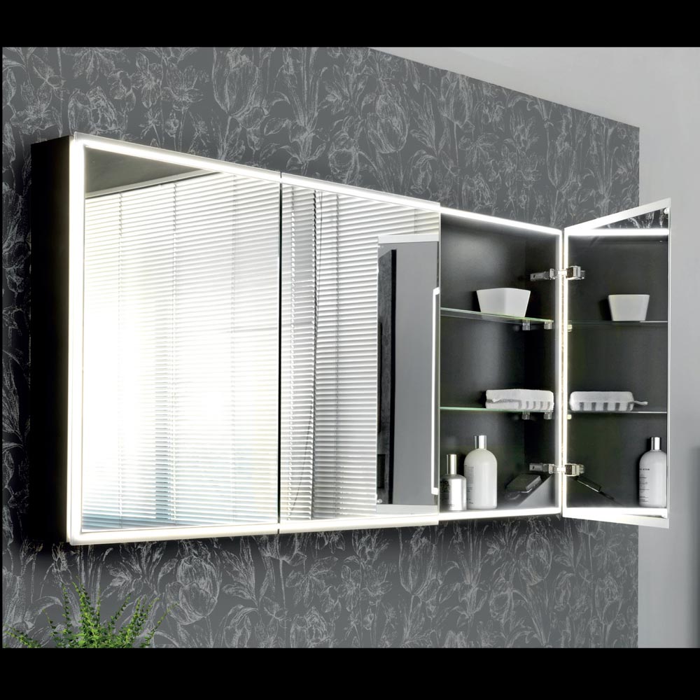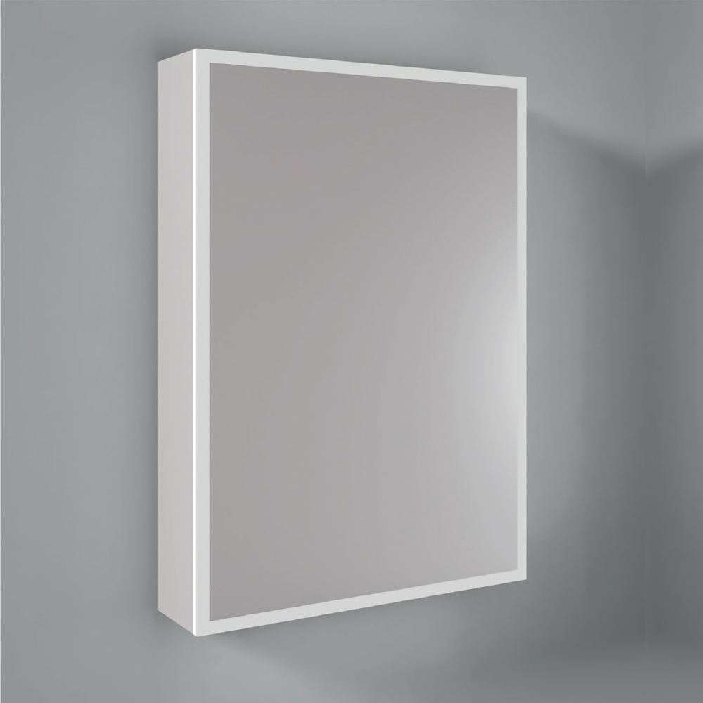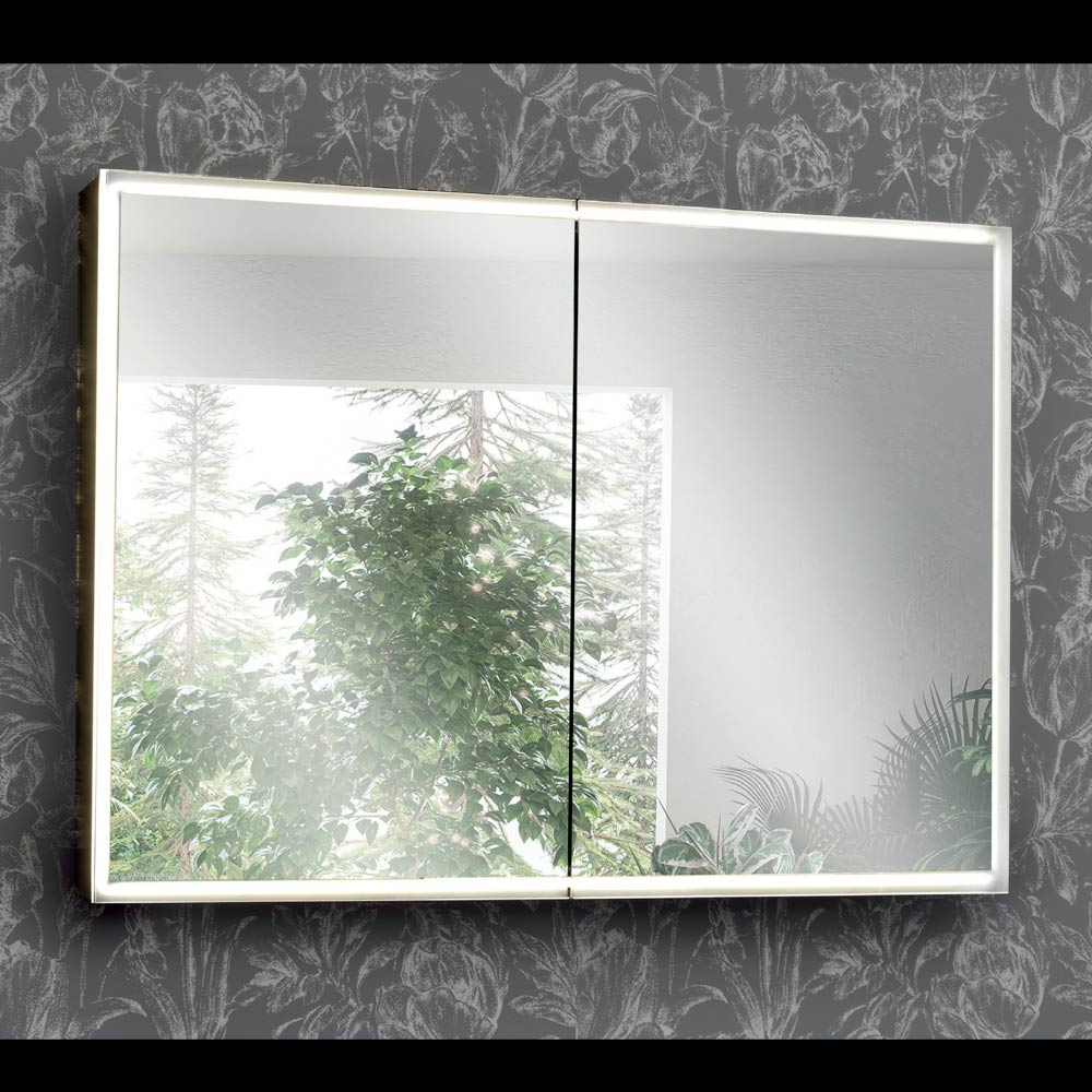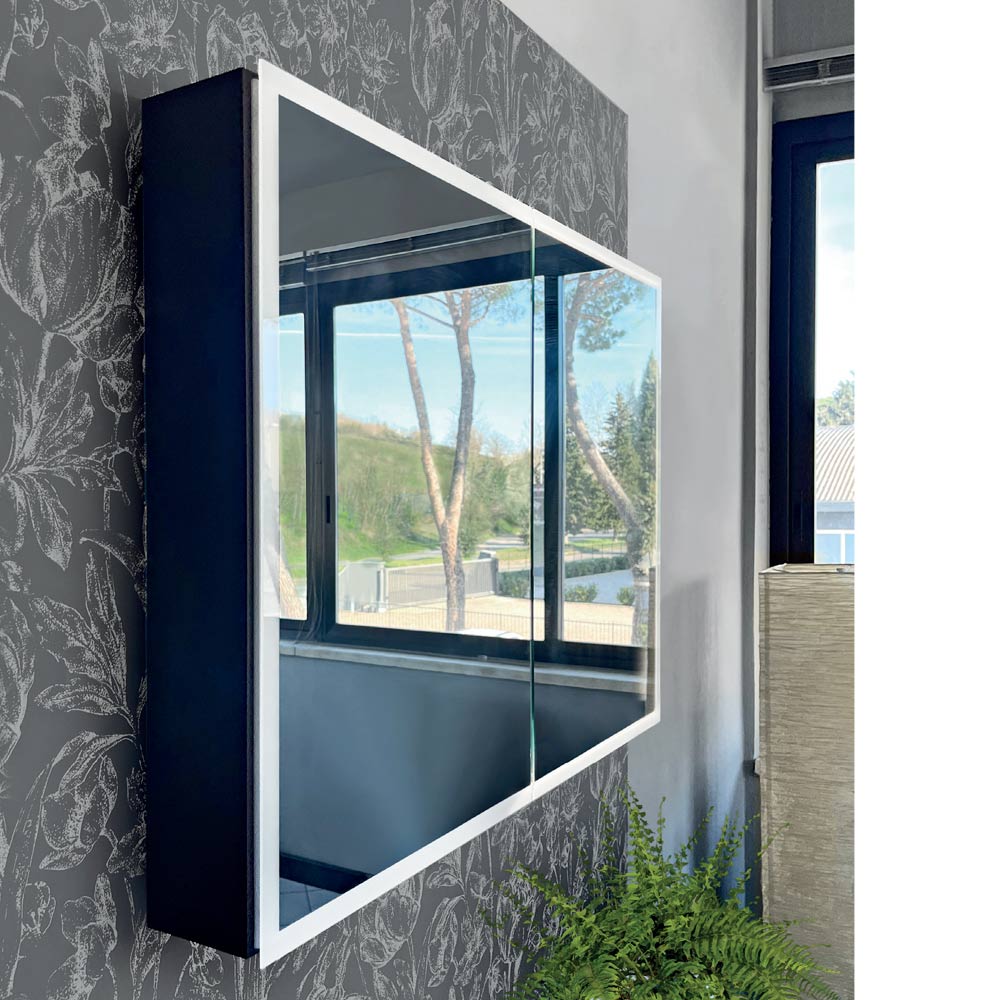 De dobbelte spejldøre åbner for at afsløre et rummeligt indre område, ideelt til at holde alle dine personlige plejeprodukter organiseret. LED-lyset fremhæver ikke kun designet, men giver også funktionelt lys, hvilket gør det perfekt til makeup, hudpleje eller som ekstra belysning på badeværelset.
