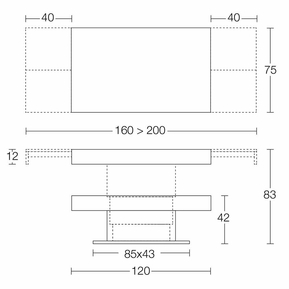 Toppen kan forlænges med to sidetillægsplader på hver 40 cm (indvendigt).