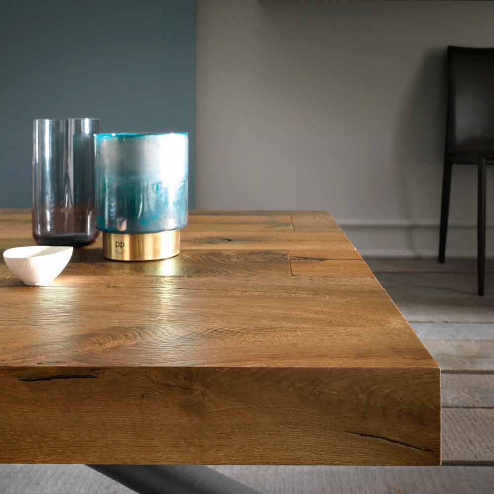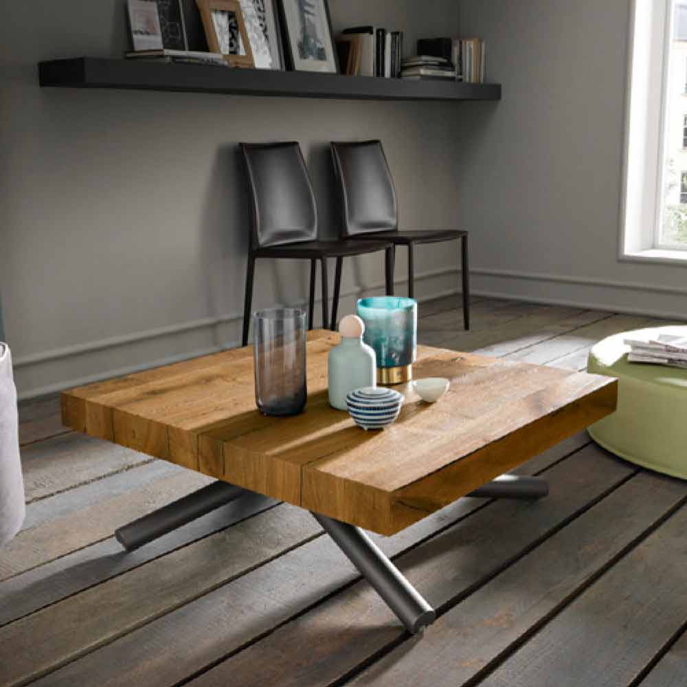 transformerbare sofabord forener konceptets modernitet og metalbenenes sammenflettede design med den mest naturalistiske og værdifulde del af den tykke plade (8 cm) i massiv eg.