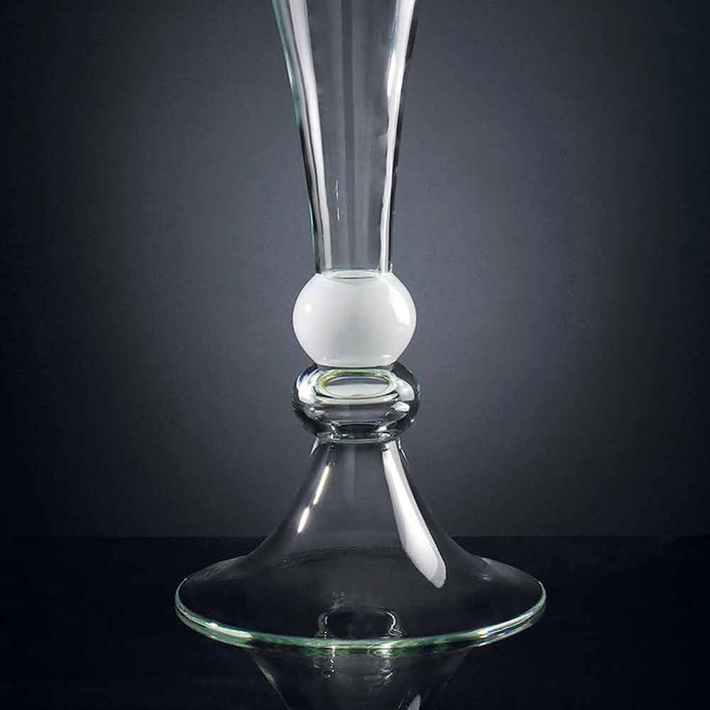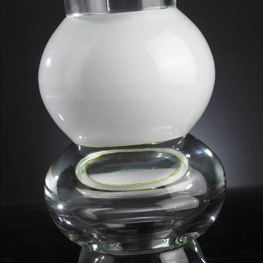Dekorativ vase til interiør i gennemsigtigt glas med hvidt glaskugle håndlavet gennem en 100% Made in Italy behandling . Dens ejendommelighed er netop repræsenteret af den håndværksmæssige produktion, der øger dens værdi og værdi for at give liv til et eksklusivt og højkvalitetsresultat såvel som til et raffineret og stilfuldt supplement , egenskaber givet ved glassets tidløse elegance. Et ideelt design til de mest varierede miljøer, lige fra boligindretning til hoteller, restauranter, kontraktområder, kurbade, men også som ramme om begivenheder og bryllupper.