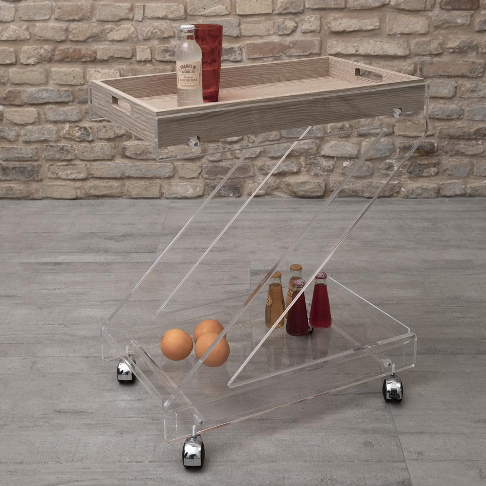 Transparent akryl krystal vogn med hjul og 2-finish bakke, fremstillet i Italien.