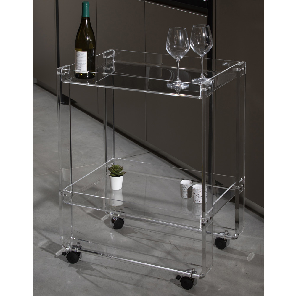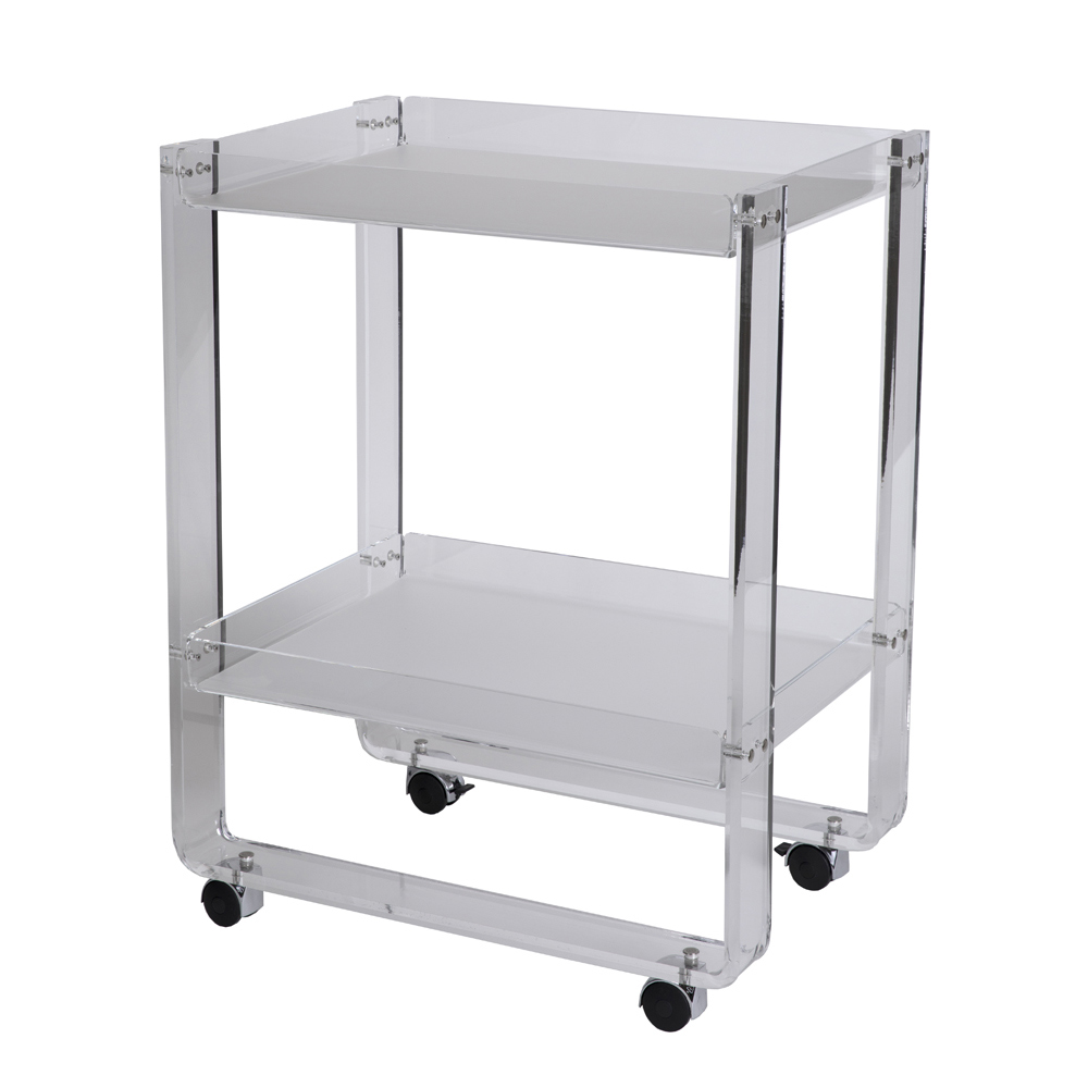 Transparent akryl krystal vogn med hjul og 2 hylder, fremstillet i Italien.