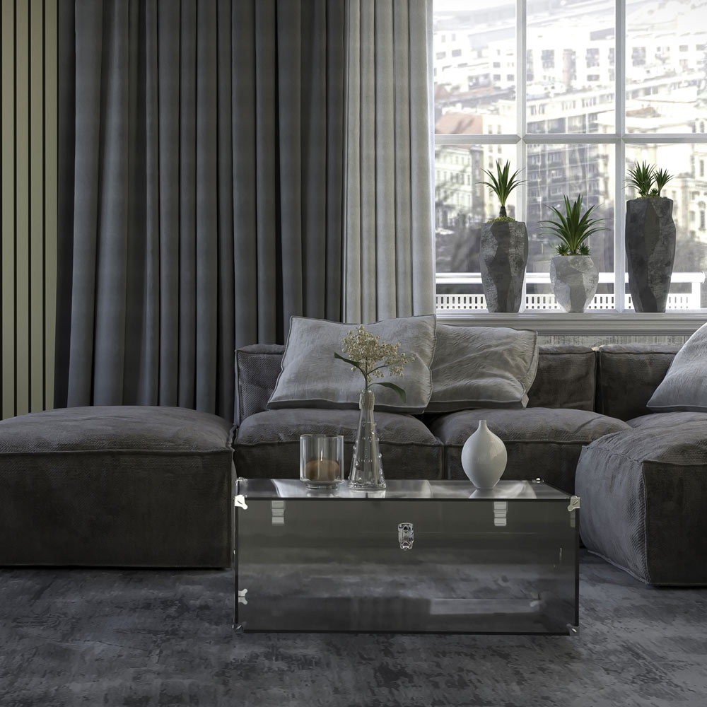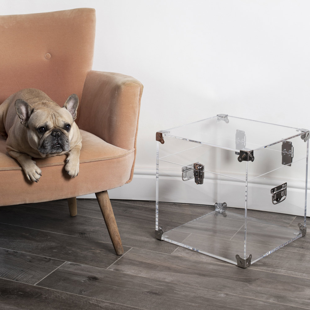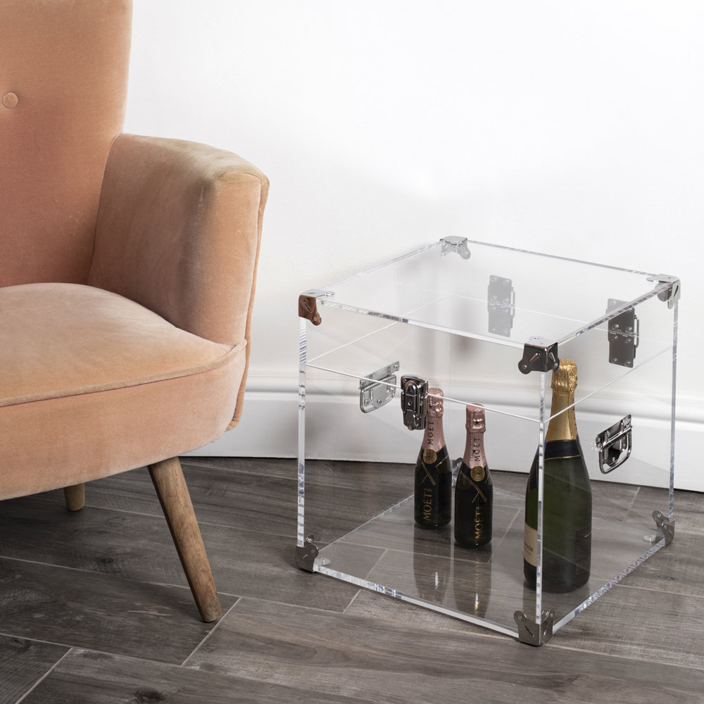 Bagagerum i gennemsigtig eller røget akrylkrystal og forkromet finish, 2 størrelser fremstillet i Italien.