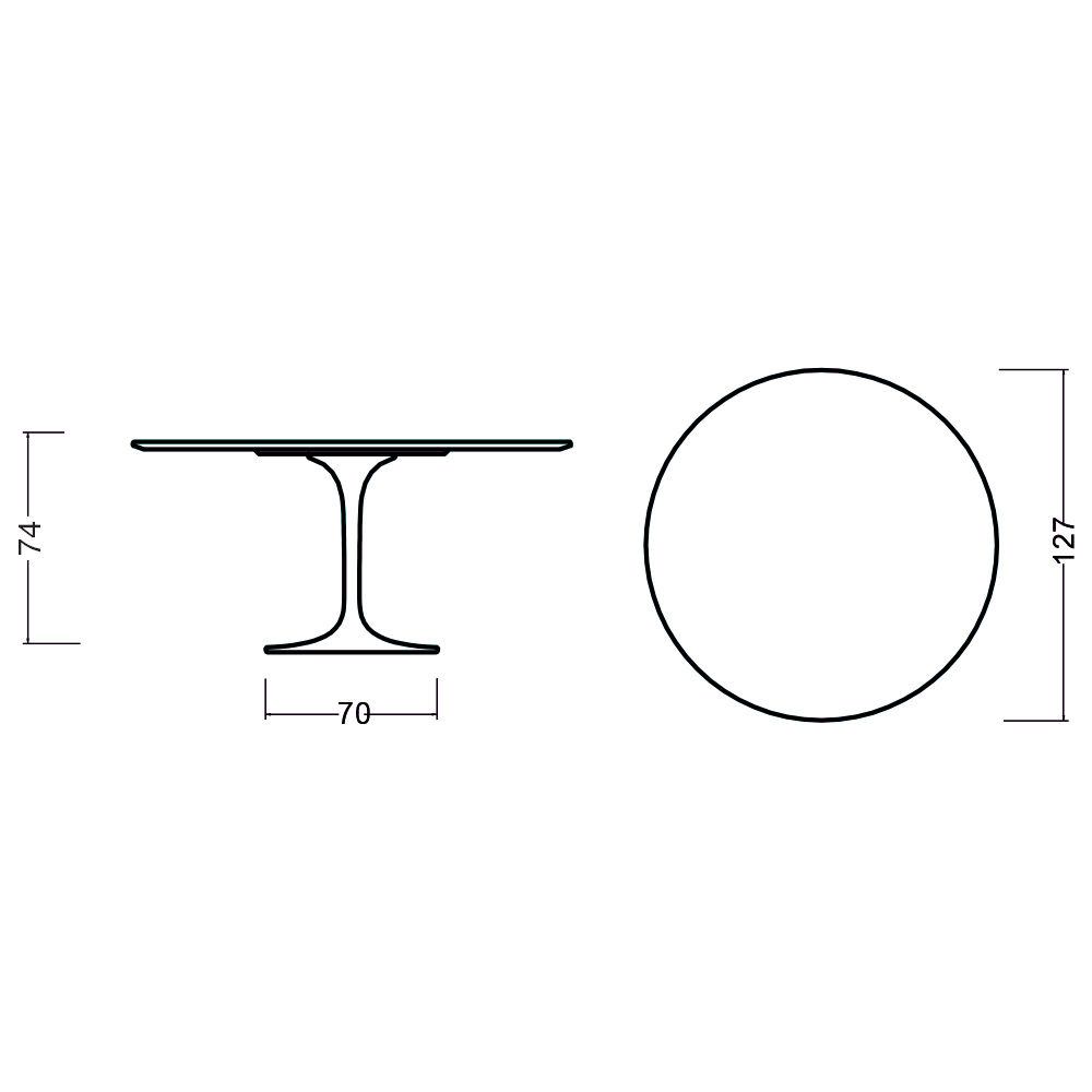- Bordpladediameter 127 x højde 74 cm / sokkeldiameter 70 cm