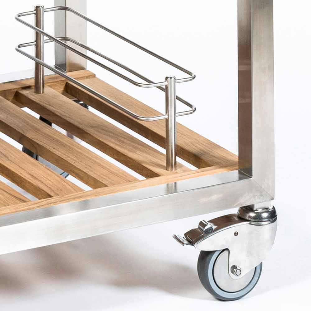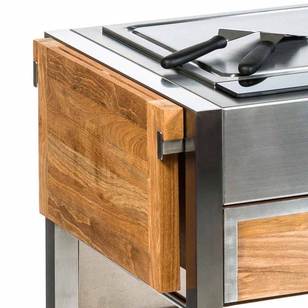 Moderne udekøkken i massivt teaktræ og rustfrit stål på hjul med unik teppanyaki-plade.